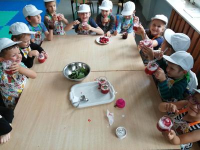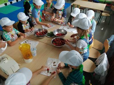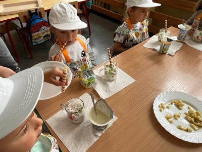 Dzieci z grupy Motylki wykonały desery owocowe pod nazwą truskawkowa fantazja. Przedszkolaki ozdobiły swoje sorbety liśćmi świeżej mięty, rodzynkami oraz słodkimi chrupkami.