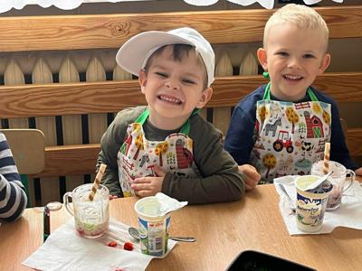Grupa Krasnoludki przygotowała jogurtowe deserki ze świeżymi owocami. Kolorowe pucharki zostały udekorowane galaretką i waflową rurką.