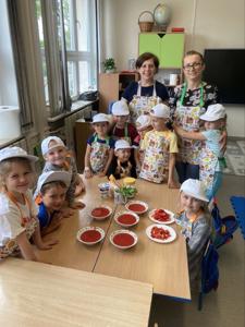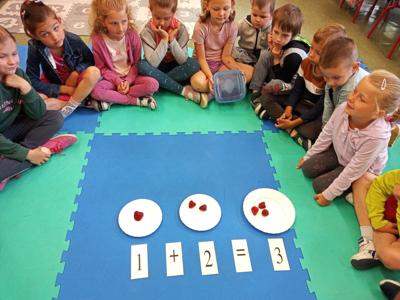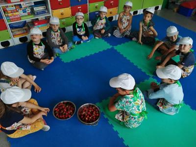 Dzieci polisensorycznie zapoznały się z różnymi owocami, wzięły udział w zabawach ruchowych i matematycznych. Przedszkolaki rozwiązywały zagadki, wykonywały ćwiczenia gimnastyczne oraz spróbowały jak smakują m. in. truskawki, borówki, poziomki czy czereśnie.