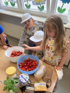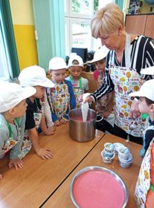 Starsze dzieci z grupy Muchomorki trenowały swoje umiejętności kulinarne oraz matematyczne podczas przygotowywania truskawkowych sorbetów z dodatkiem banana i biszkoptów.
