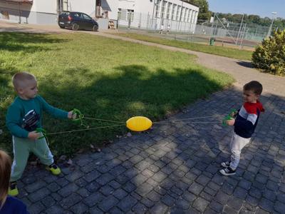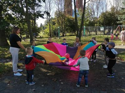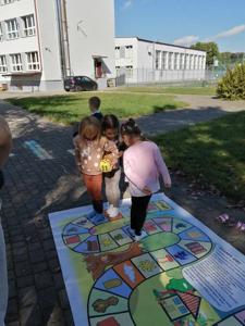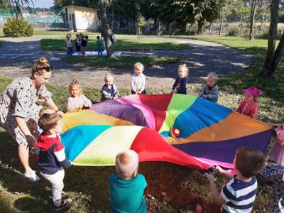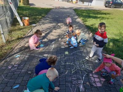 Po śniadaniu dzieci z młodszych oddziałów przedszkolnych spotkały się na placu obok przedszkola i zostały zaproszone do wspólnej zabawy z chustą animacyjną i bańkami mydlanymi. Przedszkolaki z grupy Misie spróbowały swoich sił w ogromnej grze planszowej. Na placu przedszkolnym było też wspólne malowanie kredą i zabawy ruchowe, które pomogły zintegrować społeczność przedszkolną.