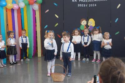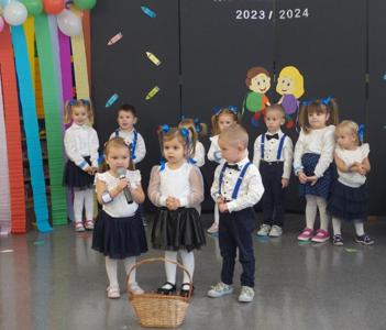 Uroczystość rozpoczęła się od powitania gości i przedstawienia krótkiej części artystycznej, w której dzieci prezentowały wiele umiejętności, takich jak recytowanie wierszyków oraz wspólne śpiewanie piosenek. Po części artystycznej, dzieci złożyły uroczyste przyrzeczenie, które zaznaczyło ich rolę w życiu przedszkola oraz określiło ich zadania, które będą realizować podczas uczęszczania do naszej placówki. Nasze najmłodsze przedszkolaki złożyły obietnicę, że dzień rozpoczynać będą od uśmiechu, będą słuchać swoich pań, pomagać kolegom i smacznie zjadać pyszne obiadki z talerzyka .