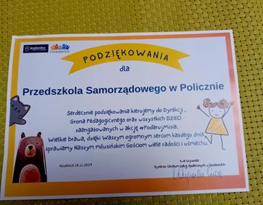 Pod koniec listopada dzieci z oddziałów przedszkolnych wzięły udział w akcji charytatywnej pt „Akcja jest taka, aby podarować pluszaka”, która polegała na zbiórce maskotek dla dzieci z okazji Dnia Misia. Celem akcji było wsparcie dzieci korzystających z pomocy Centrum Usług Społecznych w Kozienicach.