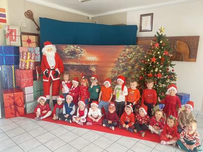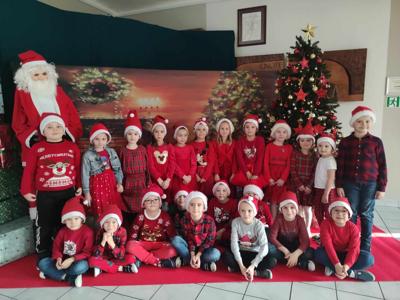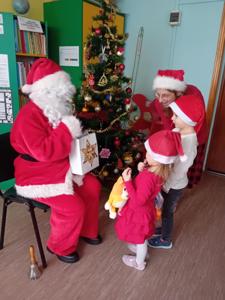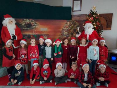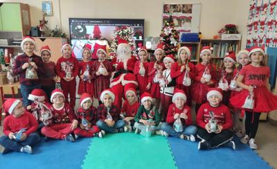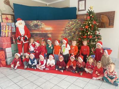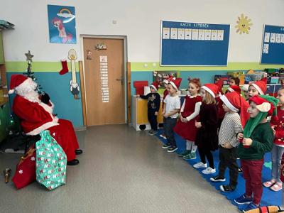 Dnia 06 grudnia w naszym przedszkolu pojawił się długo oczekiwany gość święty Mikołaj . Przedszkolaki do tej wizyty bardzo się przygotowały ubrały choinkę oraz wykonały Mikołajowe prace. Pomimo braku śniegu we wczesnych godzinach rannych przybył do przedszkola. Na jego wizytę dzieci cierpliwie czekały . Po śniadaniu poznaliśmy legendę o św. Mikołaju. A następnie czekaliśmy na spotkanie z miłym gościem. Powitaliśmy św. Mikołaja wierszem i piosenką . Spotkanie z Mikołajem minęło w bardzo miłej atmosferze i przyniosła dzieciom wiele radości. Oprócz pełnego worka prezentów św. Mikołaj przywiózł ze sobą dużo uśmiechu. Rozmawiał z dziećmi, zachęcał ich, aby były grzeczne, słuchały rodziców i pań w przedszkolu. Cieszymy się, że Św. Mikołaj o nas pamiętał i czekamy na jego wizytę w przyszłym roku.