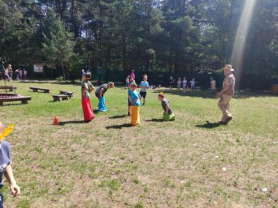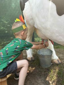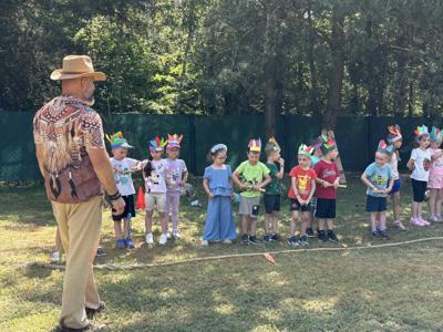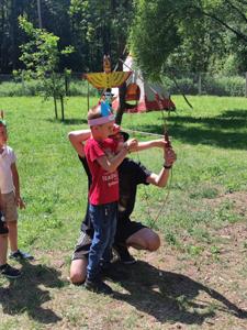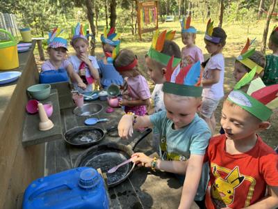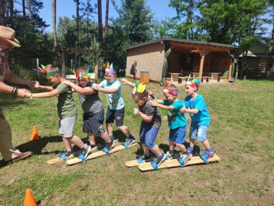 W dniu 16.06.2025r. dzieci z grup: 5 i 6 latków udały się na wycieczkę do Wioski Indiańskiej Mirabelka w Wysocinie. Celem wyjazdu było przybliżenie dzieciom kultury rdzennych mieszkańców Ameryki Północnej poprzez zabawę, warsztaty tematyczne oraz kontakt z naturą. Po przyjeździe na miejsce dzieci zostały serdecznie przywitane przez przewodników w strojach indiańskich, którzy w ciekawy i przystępny sposób opowiedzieli o życiu, zwyczajach i codzienności dawnych Indian. Dzieci miały okazję zobaczyć prawdziwe tipi, dowiedzieć się, czym zajmował się wódz, jak wyglądało życie w plemieniu oraz jak ważna była przyroda w indiańskiej kulturze. W programie wycieczki znalazły się: warsztaty plastyczne . Dzieci wykonały własne opaski indiańskie z piórkami, bransoletki z kolorowych koralików, które później dumnie nosiły przez całą wycieczkę. Nie zabrakło też zabaw ruchowych : strzelanie z łuku pod czujnym okiem instruktora, wyścig jaszczurek. Dzieci miały też możliwość dojenia krowy Mirabelki, gotowania potraw w kuchni błotnej , grały na leśnych cymbałach, poszukiwały skarbów, zjeżdżały na tyrolce … . Wycieczka do Wioski Indiańskiej „ Mirabelka” była nie tylko znakomitą formą zabawy , ale również wartościową lekcją , przyrody , historii i integracji. Dzieci wróciły do przedszkola pełne wrażeń , z uśmiechem na twarzy i bagażem nowych doświadczeń.