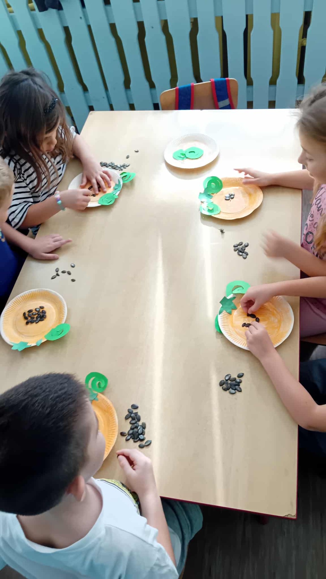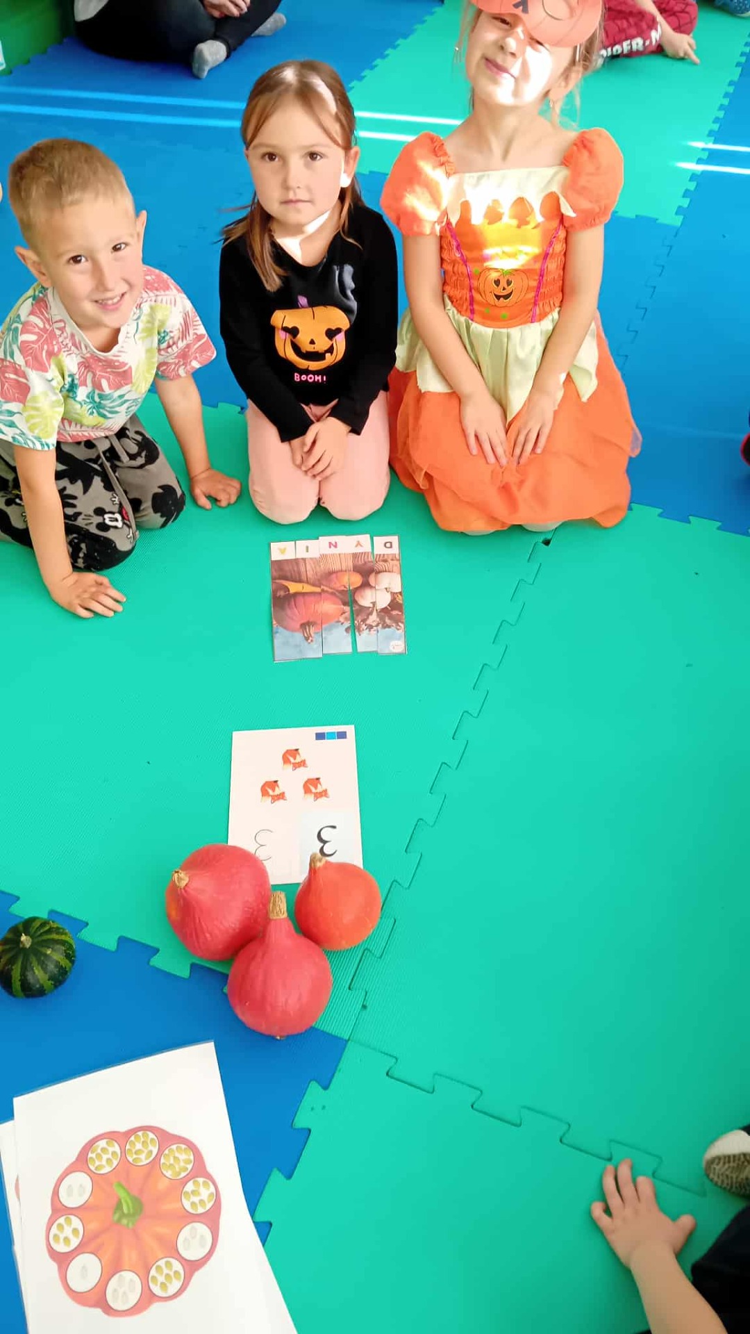 Podczas zajęć dydaktycznych przedszkolaki ćwiczyły umiejętności matematyczne – przeliczały dynie i pestki dyni, porównywały ich wielkość oraz utrwalały pojęcia „więcej”, „mniej” i „tyle samo”.