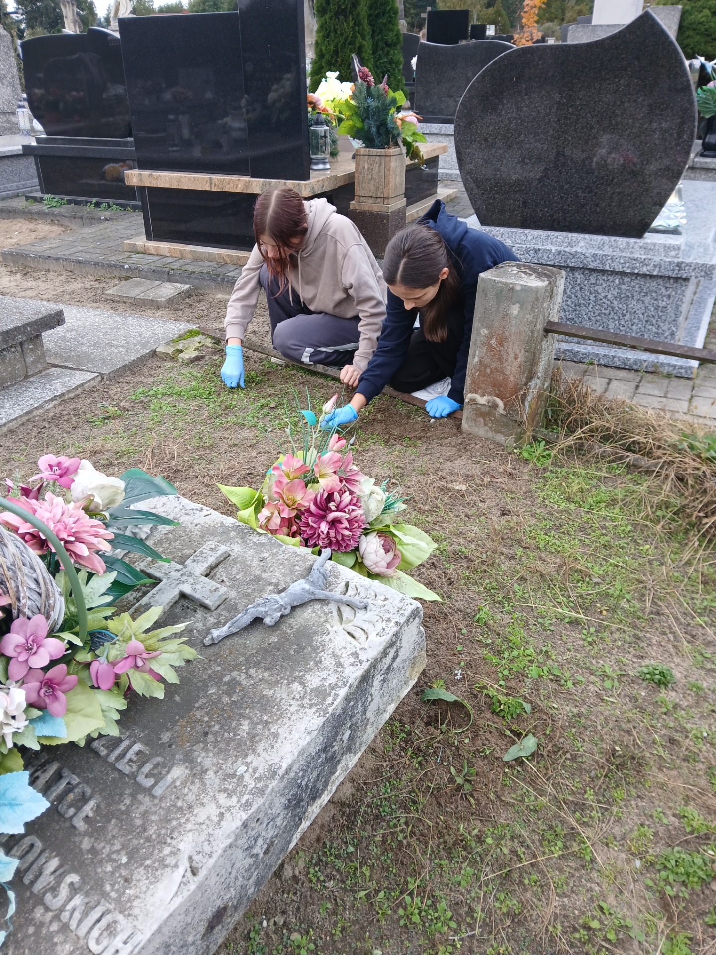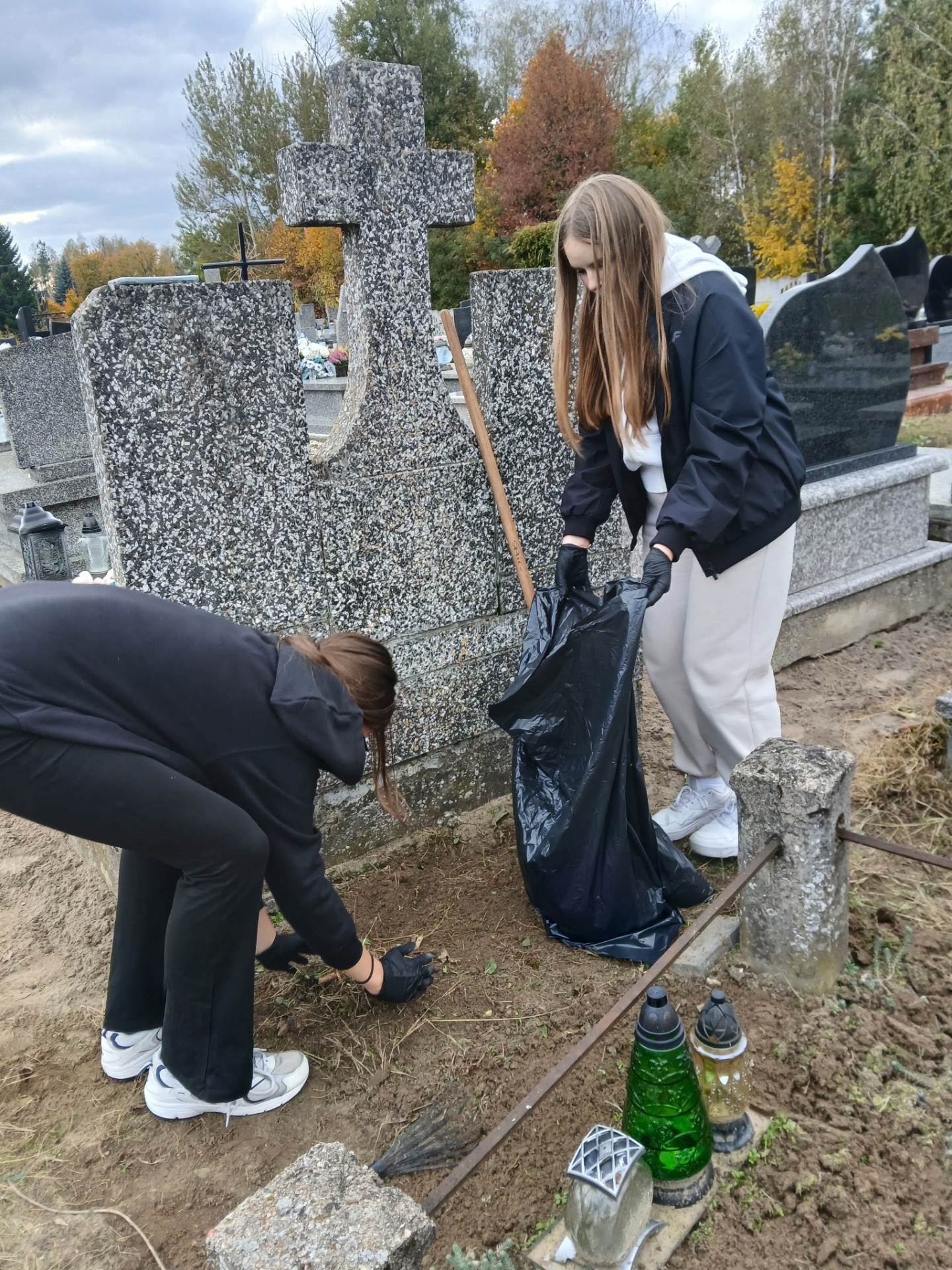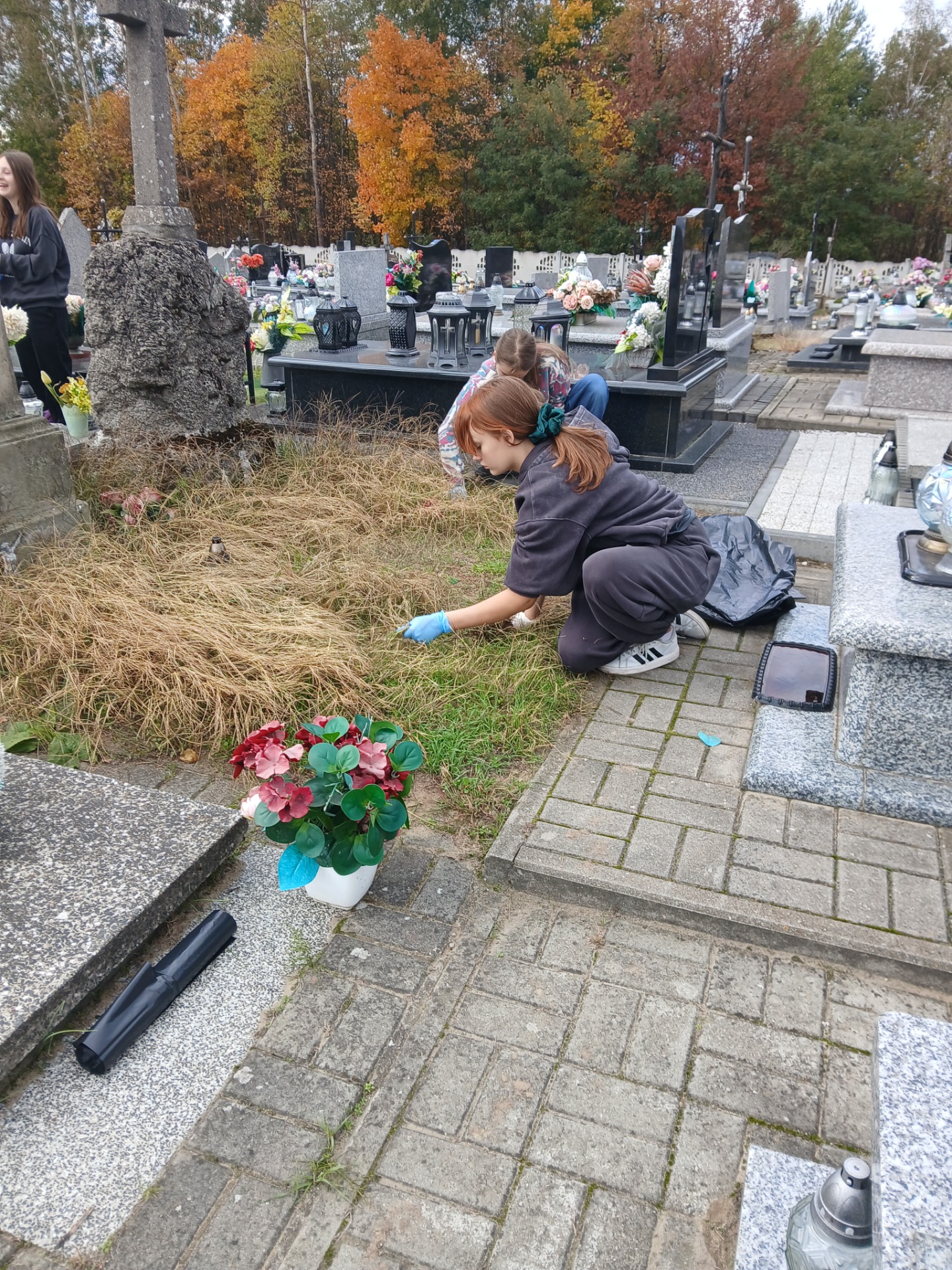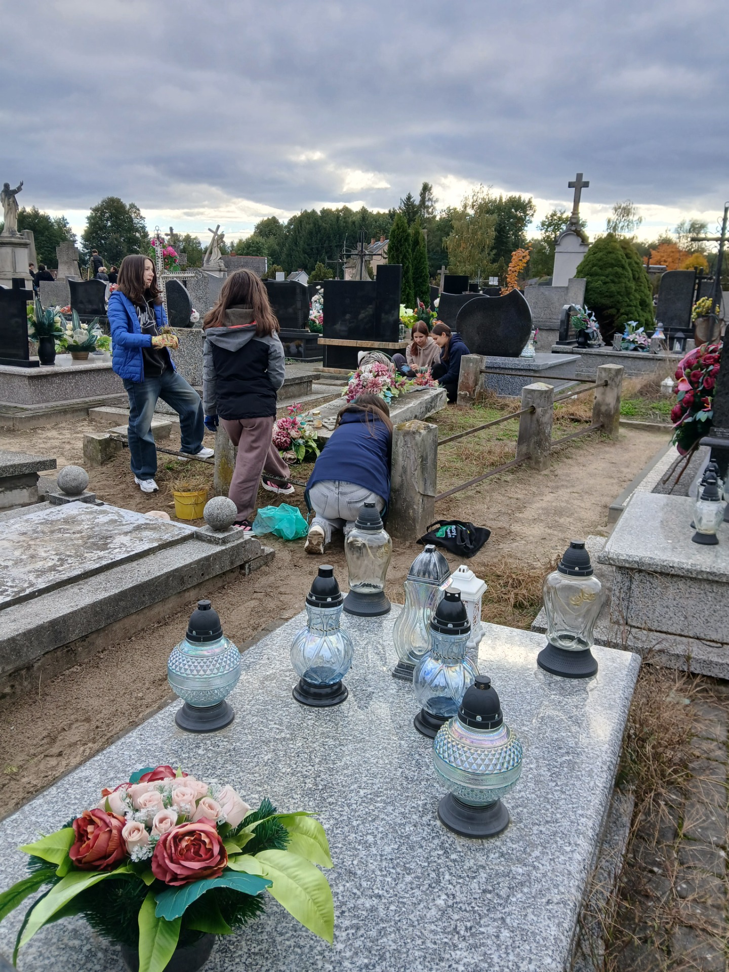 Uczniowie należący do KOŁA WOLONTARIATU razem z opiekunami zorganizowali akcję sprzątania grobów na lokalnym cmentarzu. Wolontariusze z zaangażowaniem porządkowali zaniedbane miejsca, grabili liście, myli nagrobki i zapalali znicze. Działanie to miało na celu nie tylko uczczenie pamięci zmarłych, ale także kształtowanie postaw szacunku i odpowiedzialności społecznej. Wspólna praca przyniosła wiele satysfakcji i była pięknym przykładem młodzieżowej inicjatywy.