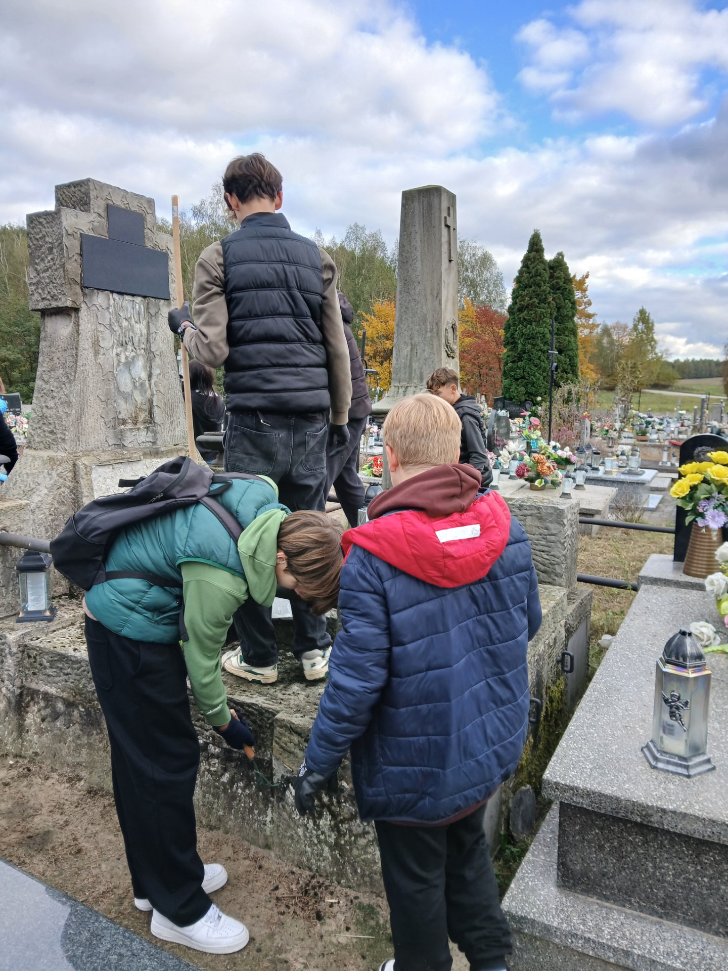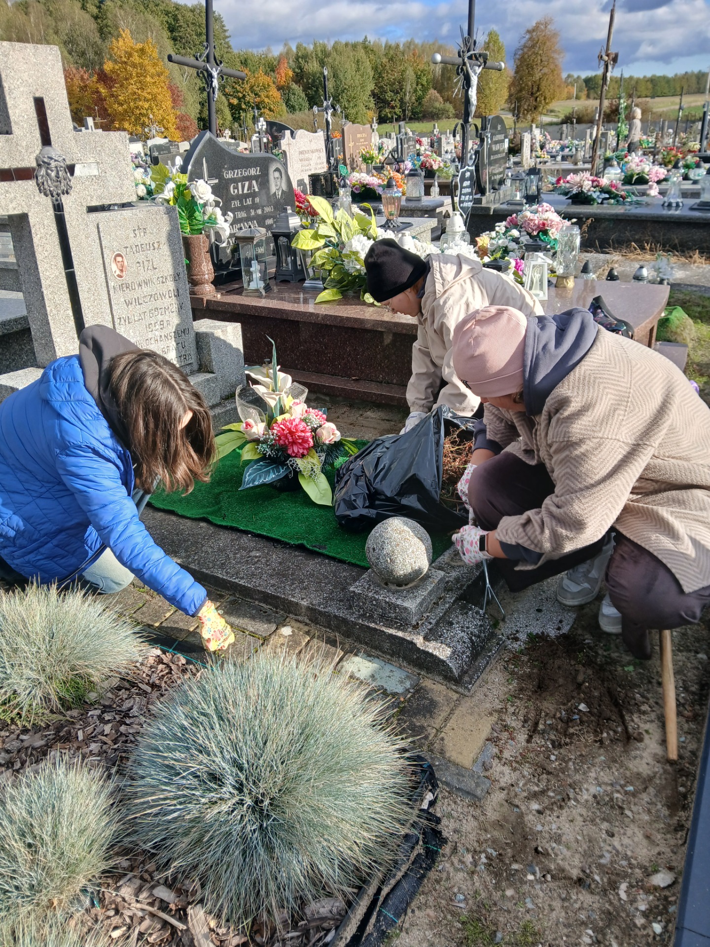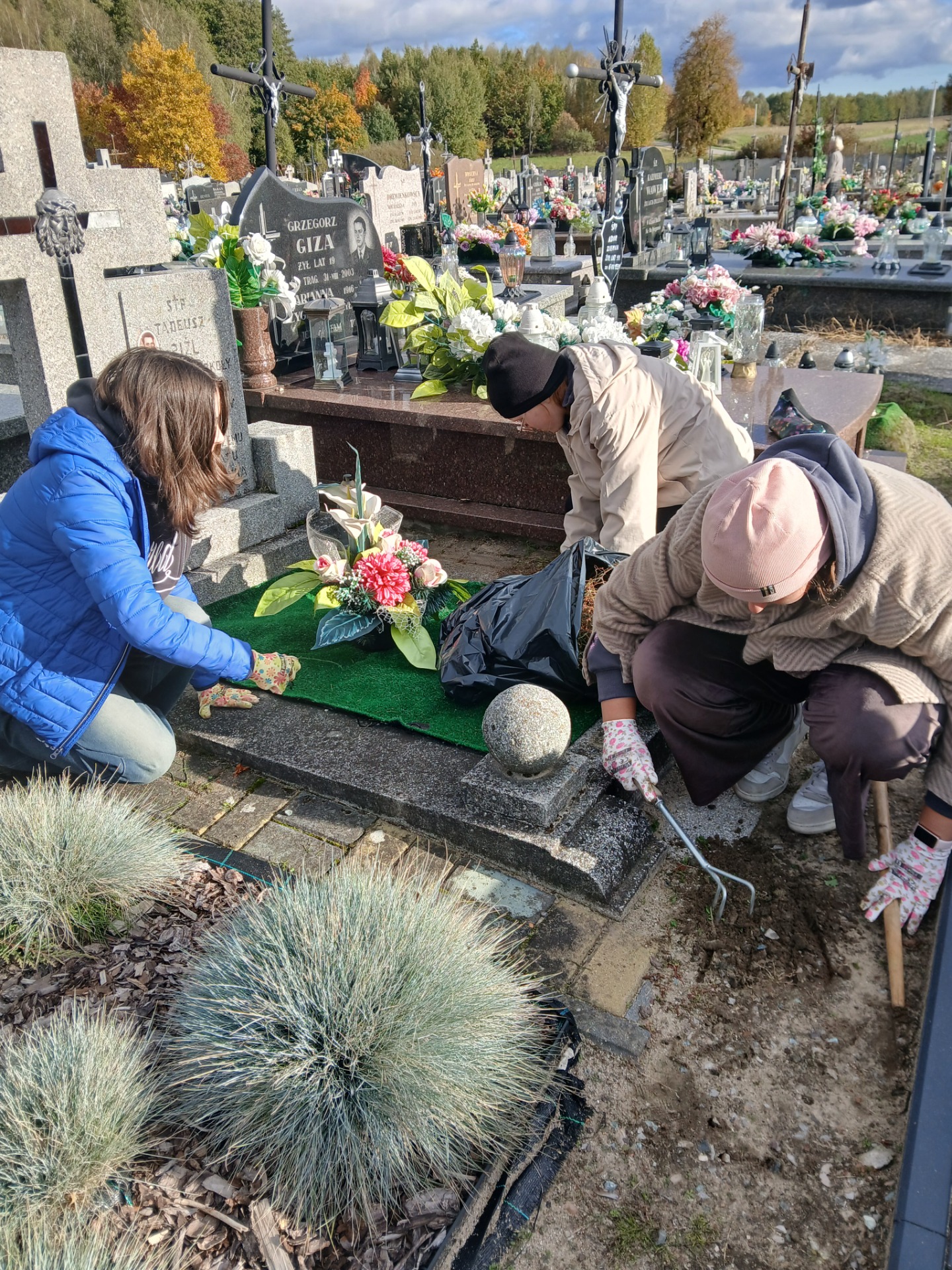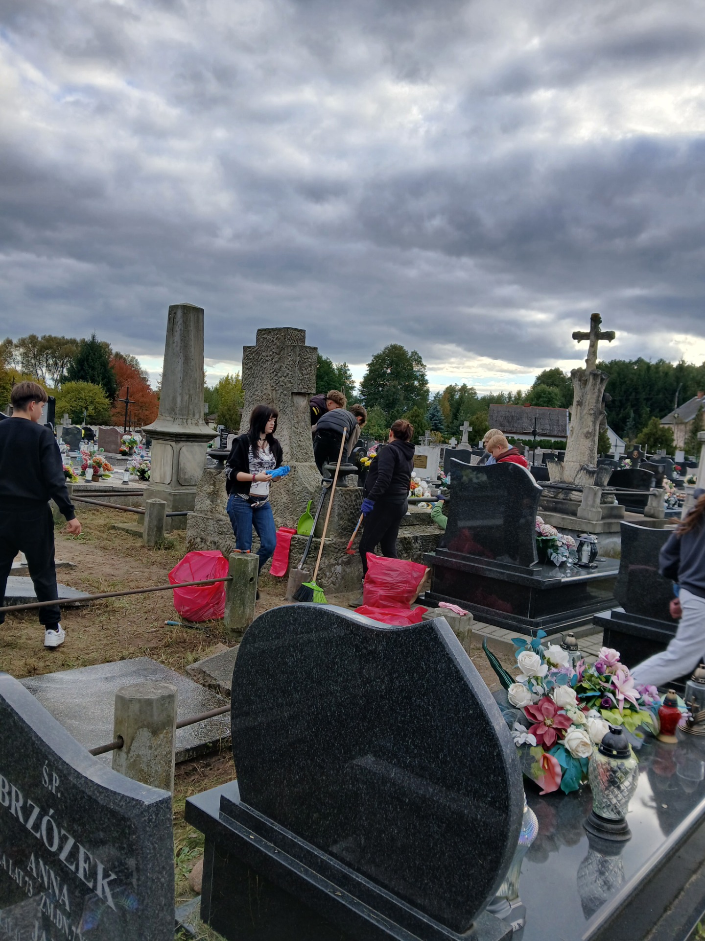 Uczniowie należący do KOŁA WOLONTARIATU razem z opiekunami zorganizowali akcję sprzątania grobów na lokalnym cmentarzu. Wolontariusze z zaangażowaniem porządkowali zaniedbane miejsca, grabili liście, myli nagrobki i zapalali znicze. Działanie to miało na celu nie tylko uczczenie pamięci zmarłych, ale także kształtowanie postaw szacunku i odpowiedzialności społecznej. Wspólna praca przyniosła wiele satysfakcji i była pięknym przykładem młodzieżowej inicjatywy.