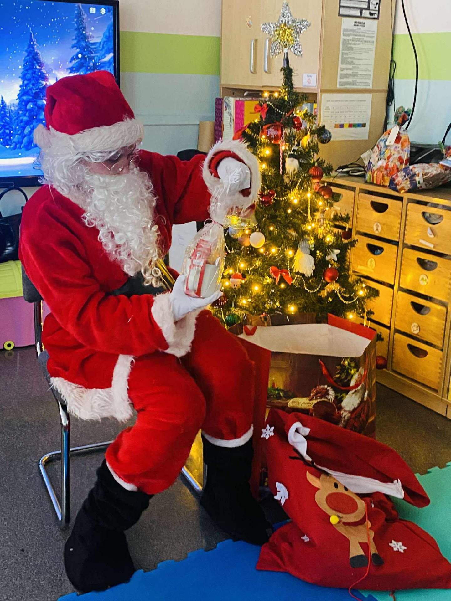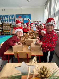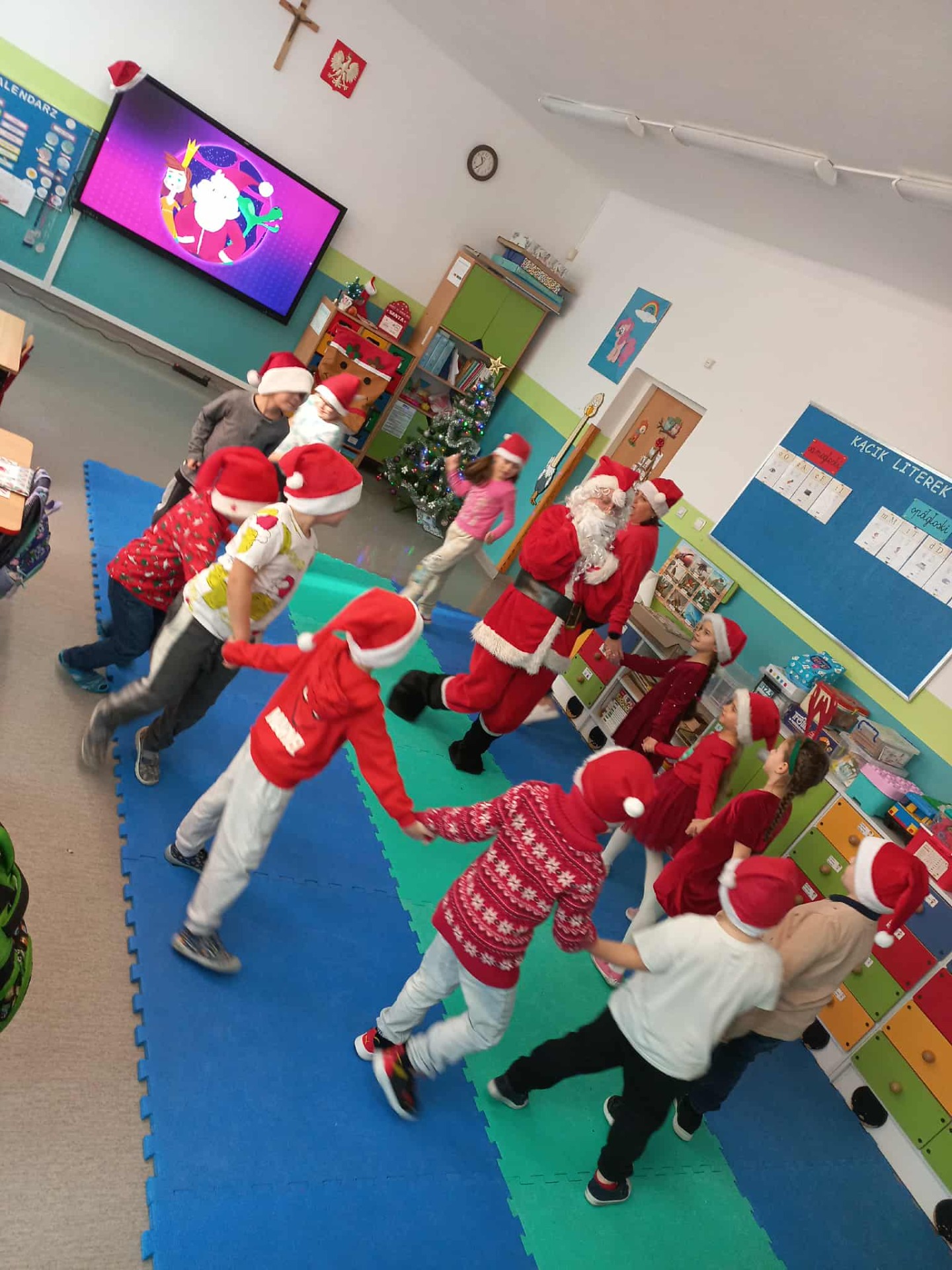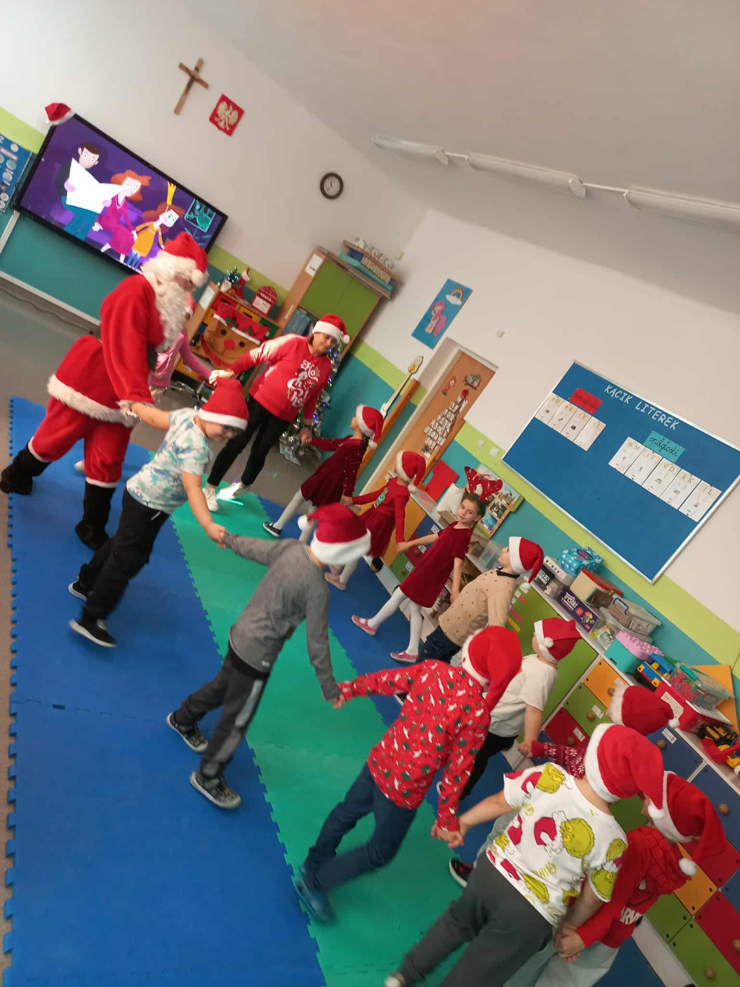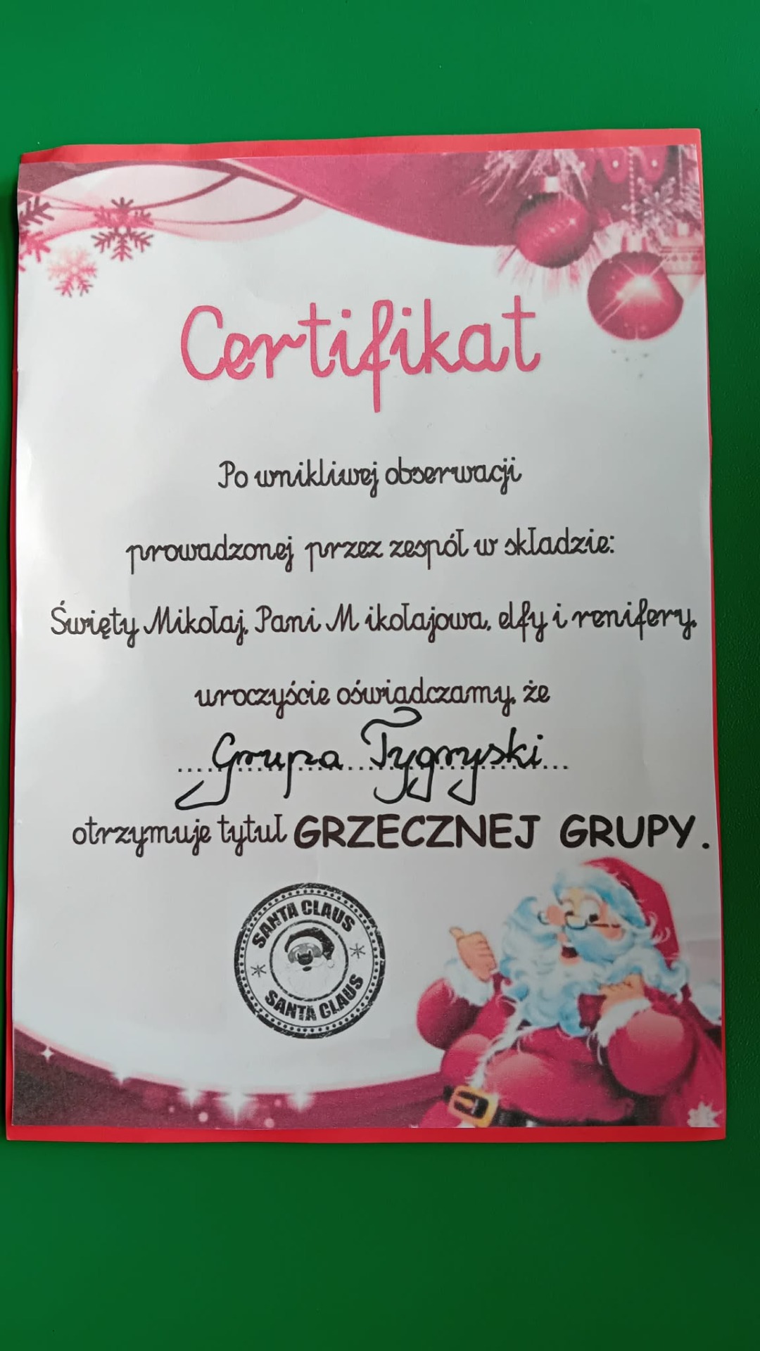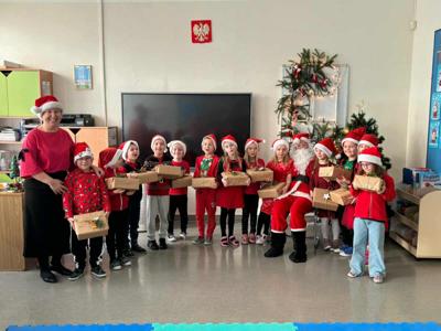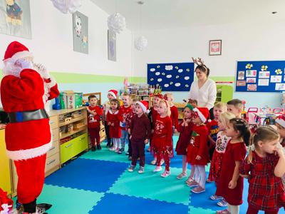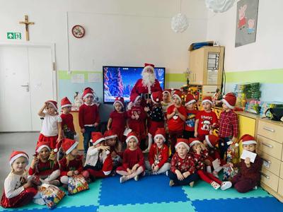 6 grudnia nasze przedszkole oraz oddziały przedszkolne odwiedził wyjątkowy gość – Święty Mikołaj. Dzieci z niecierpliwością wyczekiwały jego przybycia, z radością wyglądając przez okna, aby jak najszybciej go zobaczyć. Tegoroczny Mikołaj zachwycił wszystkie dzieci swoim wspaniałym przygotowaniem i ogromnym zaangażowaniem, dzięki czemu jego wizyta była jeszcze bardziej magiczna. Mikołaj przyniósł ze sobą wielką Księgę Grzecznych Dzieci, w której odnalazły się wszystkie przedszkolaki. Każde dziecko otrzymało od niego Certyfikat Grzecznego Dziecka, jako potwierdzenie dobrego zachowania i codziennego wysiłku. Podczas spotkania dzieci śpiewały i tańczyły z Mikołajem świąteczne piosenki, tworząc radosną i ciepłą atmosferę. W każdej grupie Mikołaj pozostawił również mały upominek na choinkę, wywołując wiele uśmiechów.