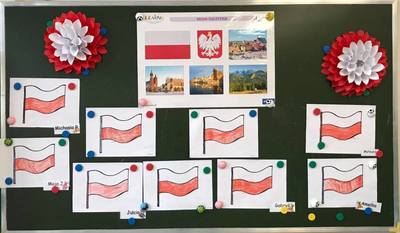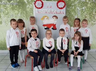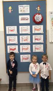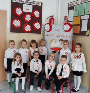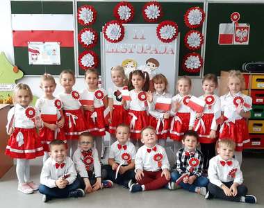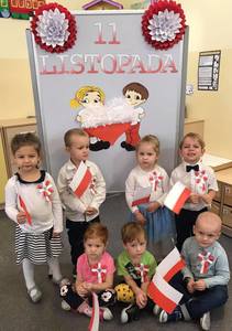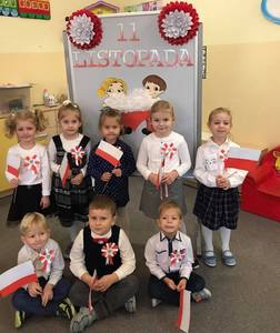 Z okazji Święta Niepodległości dzieci z wychowawczyniami wykonywały flagi, tablice, dekoracje oraz kotyliony w barwach ojczystych. W dniu 10 listopada przedszkolaki z wszystkich grup w odświętnych strojach udekorowani kotylionami dumnie przyjmując właściwą postawę ,,na baczność’’ odśpiewały hymn Polski ,,Mazurek Dąbrowskiego’’.