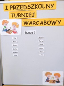 W naszym przedszkolu po raz pierwszy został zorganizowany „Przedszkolny Turniej Warcabowy”. W poniedziałkowe przedpołudnie w starszych grupach przedszkolnych tj. Muchomorkach, Motylkach i Biedronkach odbyły się eliminacje, podczas których do rozgrywek zakwalifikowało się w sumie 12- stu uczestników.