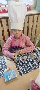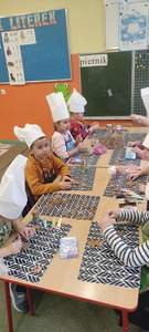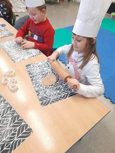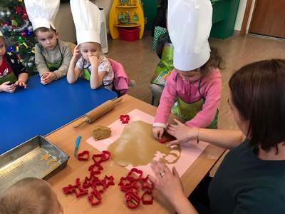 i sposób wykonania ciasta, wykrawały foremkami pyszne ciasteczka. Następnie pierniczki zostały upieczone i ozdobione. Poznały przy tej okazji figury geometryczne - koło, trójkąt i kwadrat. Wspaniały zapach unosił się w całym przedszkolu i wprawił wszystkich w świąteczny nastrój. Piękne, własnoręcznie udekorowane smakołyki dzieci zabrały do domów aby obdarować nimi swoich najbliższych.