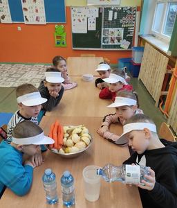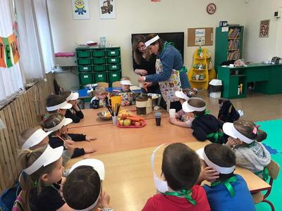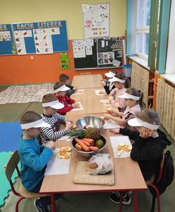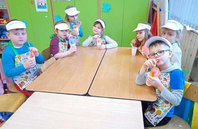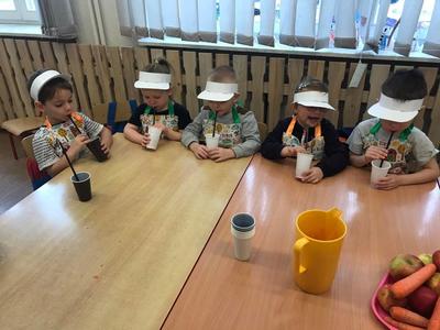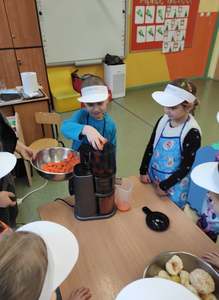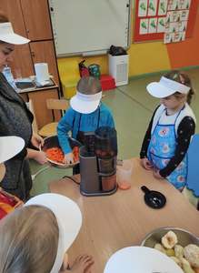 Tym razem na zajęciach z „Kuchcikowej matematyki” dzieci wykonywały sok warzywno – owocowy oraz ozdabiały biszkoptowe ciasteczka. Zajęcia rozpoczęły się od nazywania oraz opisywania kształtu i smaku warzyw i owoców. Zanim przystąpiono do pracy dzieci zapoznały się z urządzeniem do robienia soku, jego działaniem oraz utrwaliły zasady bezpieczeństwa. Następnie pełne uwagi przystąpiły do mycia produktów. Kolejnym etapem pracy był proces wyciskania soku. Mali kucharze robili to z wielkim entuzjazmem .Największą radość sprawiło wszystkim konsumowanie własnoręcznie przygotowanego soku. Wszystkim bardzo smakowały przygotowane soki, ponieważ były świeże, naturalnie słodkie i nie zawierały żadnych konserwantów. Pychotka! Grupa „Biedronki” natomiast wykonała biszkoptowe ciasteczka dla babci i dziadka. Dzieci pięknie ozdobiły przygotowane ciasteczka, kolorowymi posypkami, polewami.
