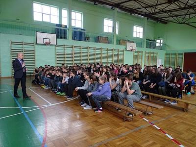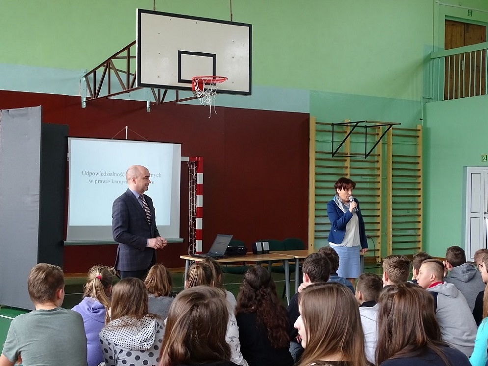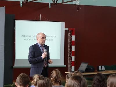 31 marca uczniowie klas piątych i szóstej szkoły podstawowej oraz pierwszych i drugich gimnazjum uczestniczyli w spotkaniu z panem Jackiem Łatą Przewodniczącym I Wydziału Cywilnego Sądu Rejonowego w Zwoleniu. Temat spotkania: „Odpowiedzialność osób fizycznych w prawie karnym i cywilnym”.