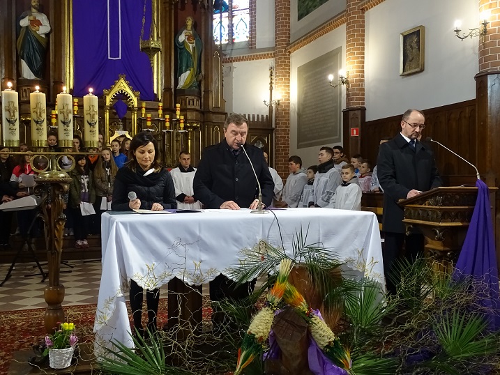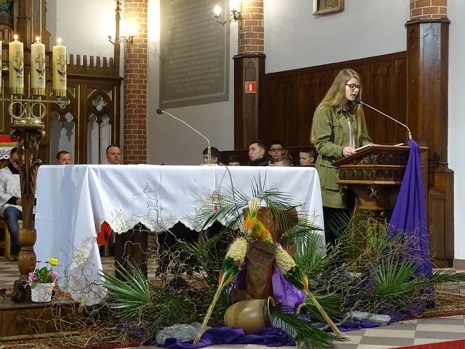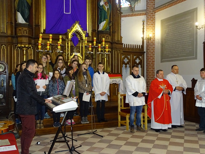 Niezwykle wzruszającym momentem nabożeństwa była przepięknie odśpiewana Pasja. Opis Męki Pańskiej zaprezentowany został z podziałem na role przez Panią Katarzynę Kubiak, Pana Zbigniewa Kuciarę i Pana Pawła Jędrę. Solistów wspierał chór szkolny pod opieką Pana Tomasza Kubiaka.