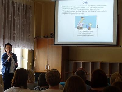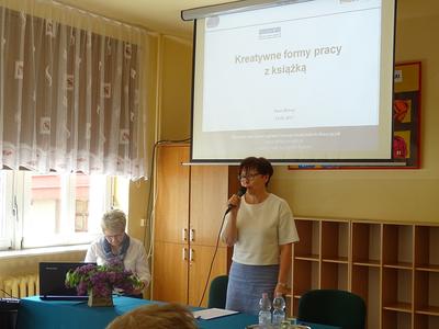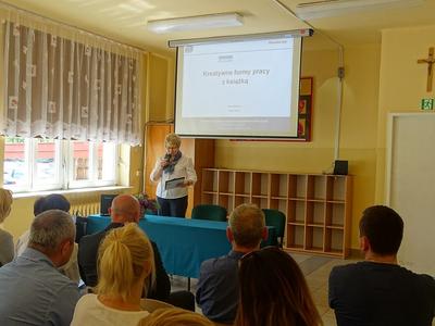 Pierwszy - „ Kreatywne formy pracy z książką” prowadziła pani Anna Równy konsultant MSCDN Wydział w Radomiu. Jego głównym celem było doskonalenie umiejętności nauczycieli w rozwijaniu zainteresowań i kompetencji czytelniczych uczniów z I i II etapu edukacyjnego oraz upowszechnianiu czytelnictwa wśród dzieci poprzez: prezentację metod, technik i ćwiczeń sprzyjających doskonaleniu kompetencji czytelniczych uczniów.