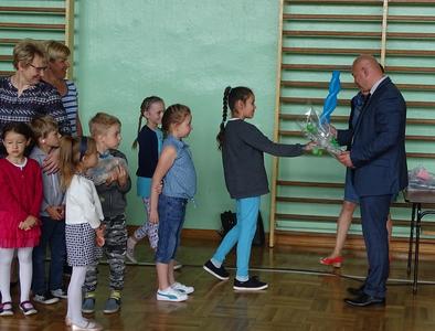 Podziękowania za życzenia i prezenty wygłosiły w imieniu wszystkich dzieci dziewczynki z najmłodszych klas i wręczyły własnoręcznie wykonana laurkę, natomiast wszyscy pozostali wyrazili swą wdzięczność poprzez gromkie brawa.