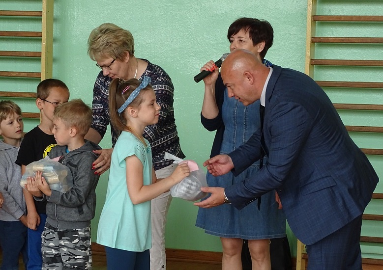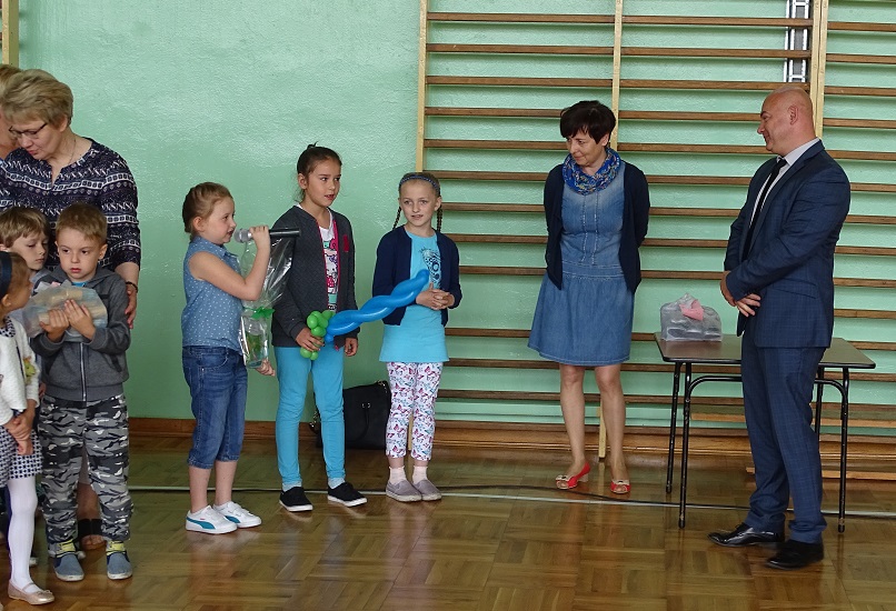 Tuż po godzinie ósmej w sali gimnastycznej zgromadziły się wszystkie dzieci i młodzież wraz z wychowawcami i nauczycielami. Powitała ich Pani Dyrektor ZPO Jolanta Kalinowska i złożyła wszystkim dzieciom gorące życzenia z okazji Dnia Dziecka. Również Wójt Gminy Policzna Pan Tomasz Adamiec skierował do dzieci wiele ciepłych słów, a każde dziecko dostało od Pana Wójta okolicznościowy podarunek - praktyczne i przydatne każdemu słuchawki.