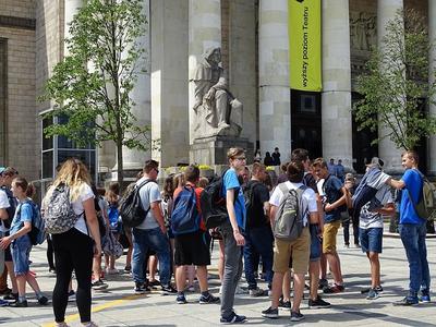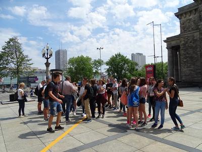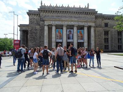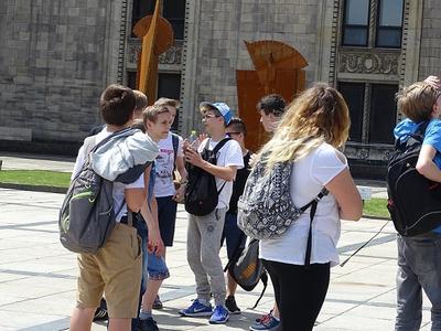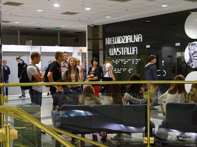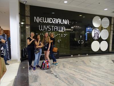 W dniu 6 czerwca 2017 roku uczniowie klas drugich i trzecich naszego gimnazjum uczestniczyli w wycieczce do Warszawy. Zwiedzanie rozpoczęliśmy od „Niewidzialnej Wystawy”. Nieco ponad godzina „spaceru” w całkowitej ciemności pozwala odkryć zupełnie inny świat, którego istnienia często nie zauważamy. Zwyczajne miejsca i sytuacje zyskują całkowicie nowy wymiar! „Widzenia świata” poprzez zmysły inne niż wzrok to dla osób widzących niezwykłe doświadczenie i niezapomniane przeżycie. Ekspozycja składa się z części widzialnej i niewidzialnej. W części widzialnej poznajemy nie tylko alfabet Braille’a i przedmioty, które pomagają osobom niewidomym lub słabo widzącym sprawniej funkcjonować w codziennym życiu, ale też oglądamy „cuda” specjalnej techniki drukarskiej pozwalającej niewidomym „widzieć” mapy, obrazy czy posługiwać się komputerem. W części niewidzialnej, po której naszymi przewodnikami i opiekunami są niewidomi, pogrążamy się w całkowitej ciemności i uczestniczymy w zaaranżowanych sytuacjach z życia. Zwiedzający badają świat za pomocą dotyku, słuchu, poczucia równowagi... Mogą zorientować się, z jakimi trudnościami borykają się niewidomi, a jednocześnie przekonać się, że życie w ciemności może być piękne i pełne. Przeżycia, które towarzyszyły nam podczas zwiedzania burzą stereotypy ucząc jednocześnie jak ważne są inne zmysły oraz pozwalają zrozumieć jak pomagać osobom niepełnosprawnym w zwykłych sytuacjach. Po wystawie wybraliśmy się pod Pałac Kultury i Nauki o którym krótko opowiedział nam Pan przewodnik.