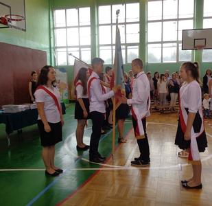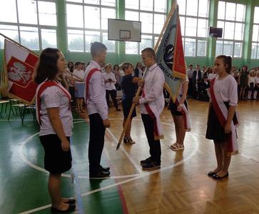 Na wstępie Pani Wicedyrektor Beata Wdowiak powitała zaproszonych gości: Pana Tomasza Adamca - Wójta Gminy Policzna, Panie Joannę Molenda i Anetę Karcz – Przewodniczące Rady Rodziców PSP i PG oraz rodziców, nauczycieli, pracowników administracji i obsługi, a przede wszystkim uczniów. Podziękowała za rok pracy i życzyła wspaniałych i bezpiecznych wakacji. Kilka ciepłych słów do uczniów skierowali także zaproszeni goście. Ważnym momentem uroczystości było przekazanie sztandaru Publicznego Gimnazjum młodszym kolegom.