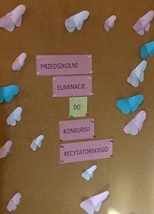 We wtorek 5 marca 20019 r. odbyły się w naszym przedszkolu eliminacje do 36. Małego Konkursu Recytatorskiego. Przystąpiło do nich piętnaścioro dzieci z trzech oddziałów przedszkolnych. Dzieci starannie przygotowywały się do recytacji wybranych tekstów literackich pod kierunkiem swoich nauczycieli i z pomocą rodziców. Podczas występów nie były stremowane i bardzo swobodnie czuły się na scenie. Ich popisy nagradzała brawami publiczność (przedszkolaki ze swoimi wychowawczyniami), a oceniało powołane na tę okoliczność jury w składzie: pani Anna Nowak - bibliotekarka, pani Marta Figura - logopeda i pani Joanna Spytek - praktykantka. Zgodnie z werdyktem jury na przeglądzie w Zwoleniu Policznę reprezentować będą następujący młodzi recytatorzy: