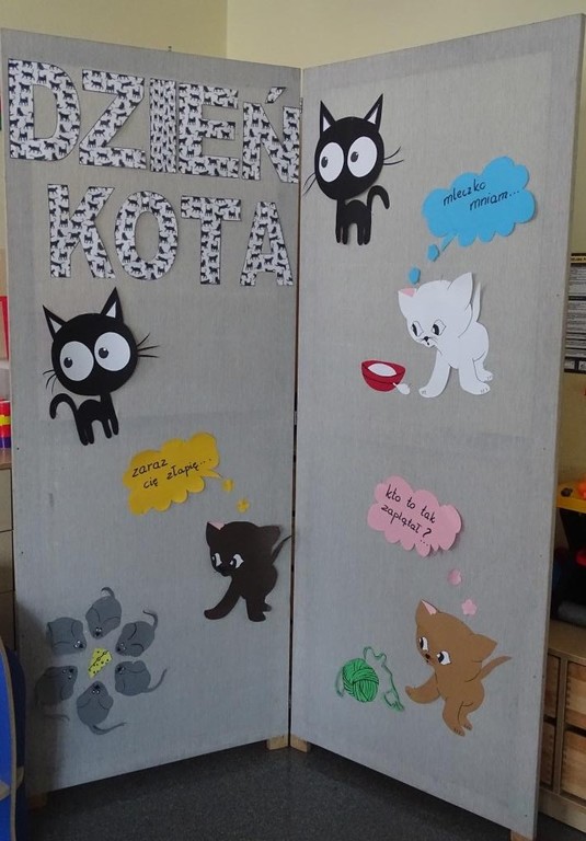 Ze względów organizacyjnych obchody Dnia Kota w naszym przedszkolu zostały przeniesione na piątek 22 lutego 2019r. Już kilka dni wcześniej dało się zauważyć pewne przygotowania - ktoś malował farbami wielkie plakaty z puszystymi kotkami, dzieci mozolnie sklejały elementy układanki z kocurami, inne wycinały kolorowe kontury postaci kotów i myszy, ktoś następny poszukiwał kłębków kolorowej włóczki czy wycinał litery na hasło.