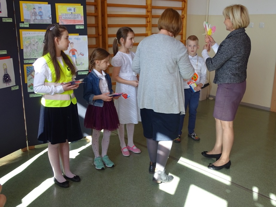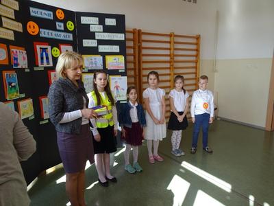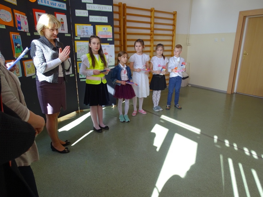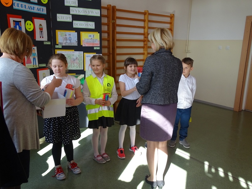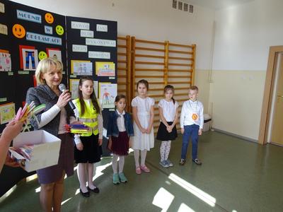 Po omówieniu wszystkich realizowanych programów pani dyrektor B. Wdowiak pogratulowała zwycięzcom i wręczyła nagrody. Natomiast dzieci z oddziałów przedszkolnych otrzymały od swoich starszych kolegów kolorowe odblaski.