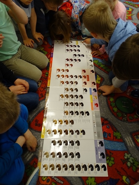 Kolejną mamą, dzięki której dzieci z grupy Motylków i Muchomorków poznają zawody swoich rodziców jest mama Zosi. Pani Adela jest fryzjerką i mimo, że obecnie nie pracuje w salonie fryzjerskim, to bardzo lubi swój zawód. Na spotkanie z dziećmi przyniosła wiele przyborów i narzędzi fryzjerskich, kosmetyków do układania czy farbowania włosów oraz profesjonalne fryzjerskie urządzenia elektryczne. Ciekawie opowiadała o różnych rodzajach usług świadczonych w salonach i o oczekiwaniach klientów. Chętnie też odpowiadała na zadawane jej pytania. Oczywiście największą frajdą dla dzieci były zajęcia warsztatowe. Z zaciekawieniem mieszały różne kolory farb do włosów, porównywały wałki i kołeczki, rozróżniały prostownicę od lokówki czy wreszcie poznawały różne rodzaje szczotek i grzebieni. Zatroskane o swą urodę małe kobietki ustawiały się w kolejce do pani fryzjerki i po kilku minutach miały już na głowie loki, fale albo włosy wyprostowane- to już rzecz gustu. Dziewczynki z satysfakcją przeglądały się w lusterku i były bardzo zadowolone. DZIĘKUJEMY