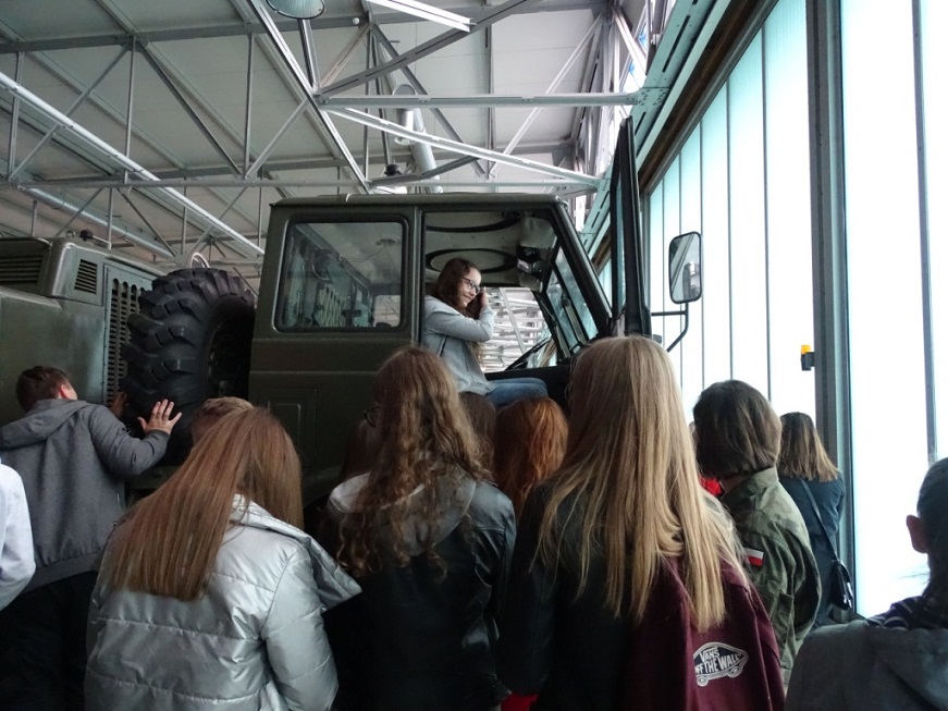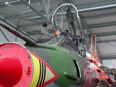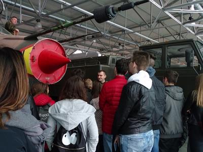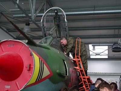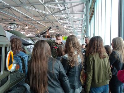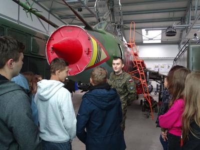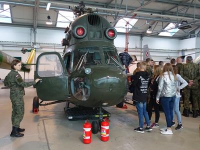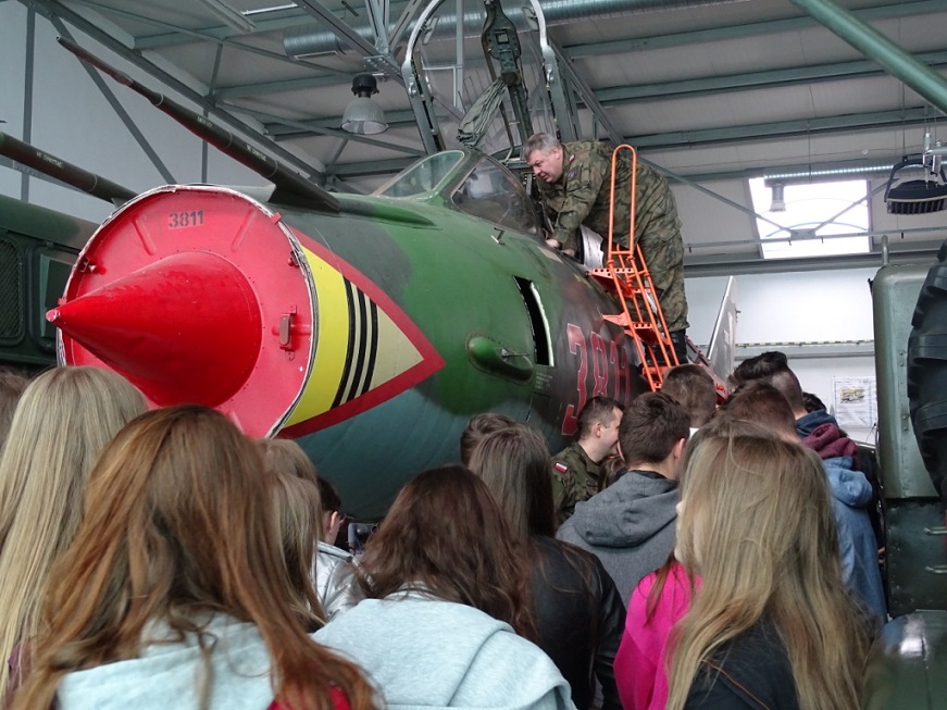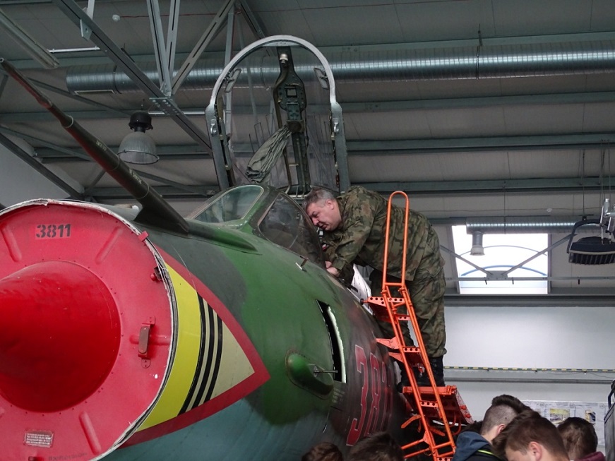 Następnie wycieczka udała się do hangaru Zespołu Obsługi Centrum Szkolenia Inżynieryjno-Lotniczego, gdzie kpt. Dariusz Kozuń opowiedział o samolotach tam stojących, o swojej pracy i ścieżce zawodowej. Każdy uczestnik mógł zasiąść za sterami samolotów : F-16, MiG-29, SU-22, TS-11 "Iskra", śmigłowców Mi-24 i Mi-8, Mi-2, „Puszczyk”. Oj niełatwo było opuścić hangar!