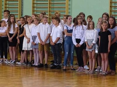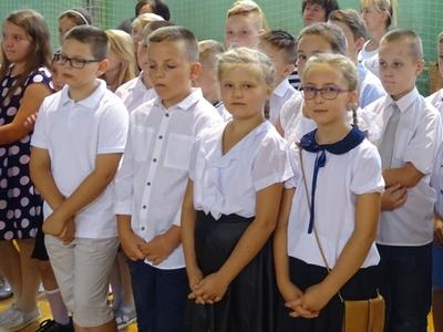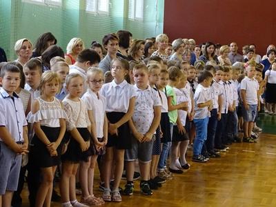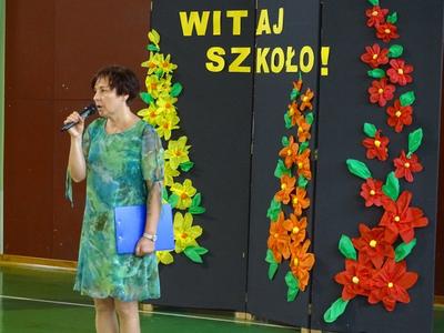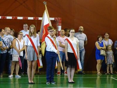 Uroczystość rozpoczęła się wprowadzeniem pocztu sztandarowego i odśpiewaniem hymnu państwowego. Następnie ponownie głos zabrała pani dyrektor Jolanta Kalinowska, która przekazała zebranym najistotniejsze informacje dotyczące funkcjonowania naszej szkoły w nowym roku szkolnym oraz życzyła wszystkim uczniom sukcesów w nauce i samych radosnych dni spędzonych w szkole.