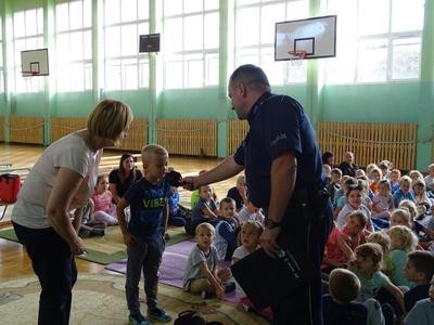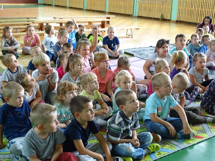 Dzieci z przedszkola, oddziałów zerowych i klas I-III miały okazję porozmawiać o bezpieczeństwie w drodze do szkoły i poza szkołą, o zasadach poruszania się po ulicy, chodniku, podczas jazdy rowerem, oczekiwania na autobus na przystanku o roli jaką pełnią elementy odblaskowe. A także o niebezpiecznych sytuacjach jakie mogą je spotkać wówczas kiedy są same w domu.