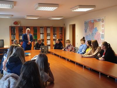 Po warsztatach uczniowie wraz z opiekunami udali się na spotkanie z Pawłem Chudzio Prezesem Sądu Rejonowego w Zwoleniu, który zaprosił ósmoklasistów do sali konferencyjnej. W trakcie spotkania nasi uczniowie mogli dowiedzieć się m.in. jak wygląda codzienna praca sędziego, adwokata, kuratora, jaką drogę trzeba przebyć, by wykonywać dany zawód oraz jak funkcjonuje wymiar sprawiedliwości w Polsce. Pan Prezes zaprowadził uczniów do jednej z sal rozpraw, gdzie zapoznał młodzież z przebiegiem rozprawy sądowej, wskazał miejsce zajmowane w czasie rozprawy przez sędziego, oskarżonego, adwokata, świadków, etc.