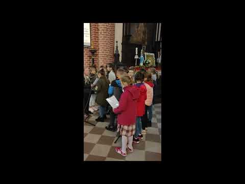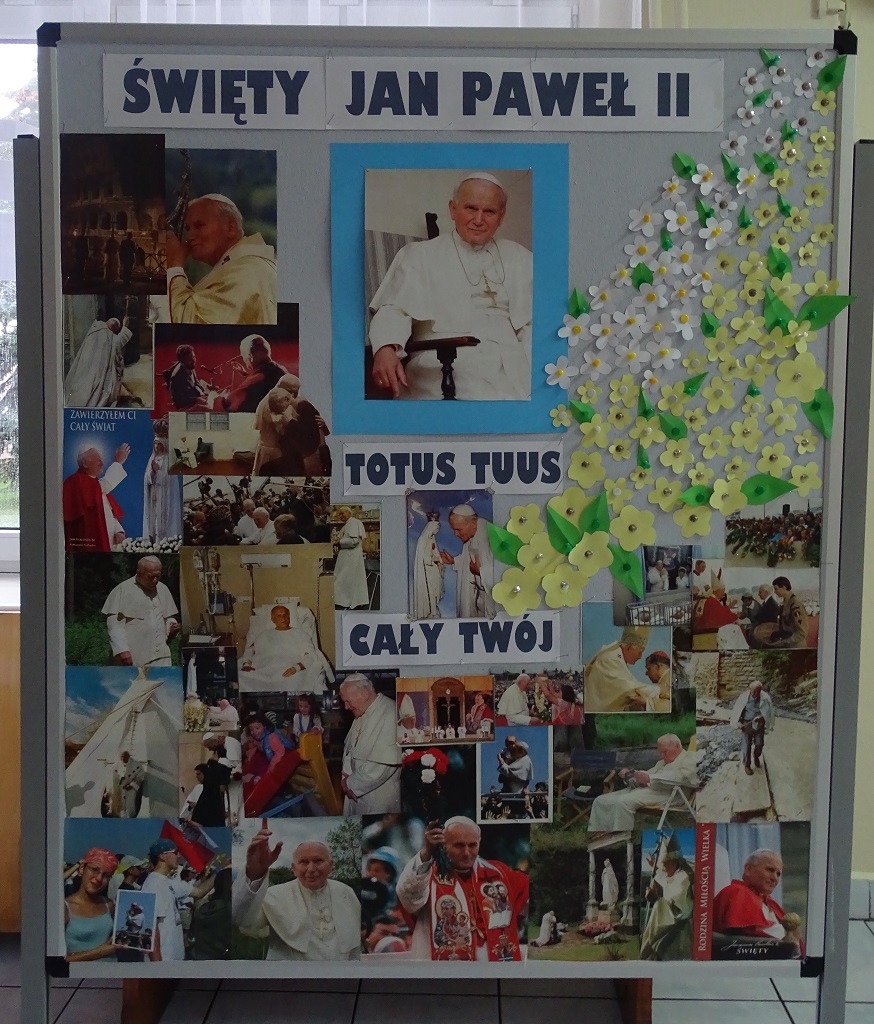 Z tej okazji uczniowie naszej szkoły przygotowali oprawę Mszy świętej. Uczniowie klasy VIII przybliżyli wiernym głębię słów „Totus Tuus” w życiu Papieża Polaka i duchowości chrześcijańskiej, natomiast w wykonaniu uczniów klas III usłyszeliśmy ulubione pieśni Jana Pawła II.
