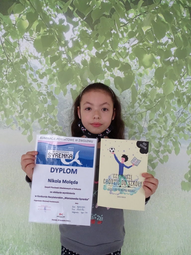 Uczennica klasy 2a Nikola Molęda już kilkakrotnie zdobywała nagrody i wyróżnienia w konkursach recytatorskich. Tym razem została wyróżniona w 44. Konkursie Recytatorskim Mała Syrenka 2021. Wspaniale, z ekspresją recytowała wiersz Hanny Niewiadomskiej pt.”Szklanka przechwalanka”.