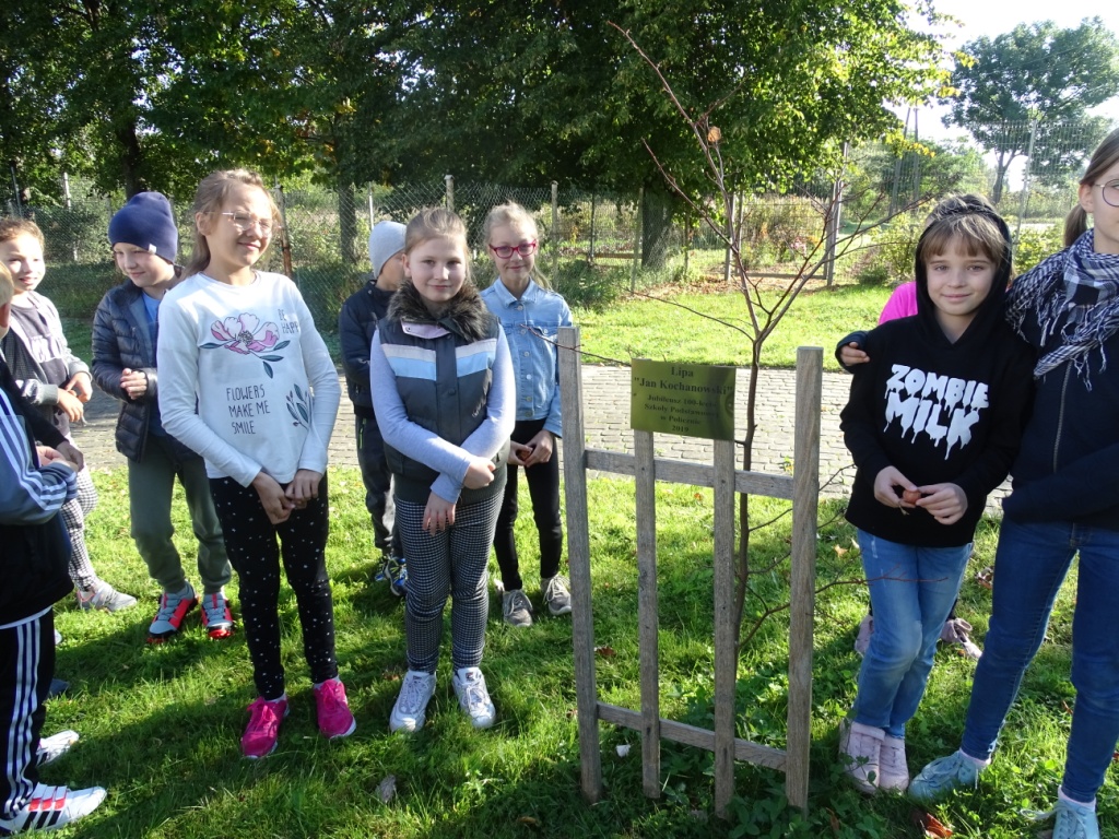 W dniu 10 października będziemy obchodzić Międzynarodowy Dzień Drzewa. Na te obchody zaplanowano już szereg działań, które będą realizowane podczas zajęć w poszczególnych klasach. Jednak klasa IIIa i IIIb już nieco wcześniej otoczyła myślą i działaniem pewne drzewo- swoją kochaną lipę. Lipę tę zasadziły dwa lata temu dzieci uczące się obecnie w klasach trzecich wraz ze swoimi wychowawcami i rodzicami. Zrobiły to w bardzo ważnym dla ucznia dniu – ślubowania i pasowania na ucznia. Okazją do posadzenia drzewa było 100-lecie naszej szkoły, a nadano mu imię –„Lipa Jana Kochanowskiego”. Dzieci systematycznie „odwiedzają” swoje drzewko; obserwują jego wzrost i rozwój, dostrzegają zmiany związane z porami roku. Natomiast teraz – przed Międzynarodowym Dniem Drzewa obsadziły tulipanami rabatę wokół swojej lipy. Każde dziecko poczuło się na chwilę małym ogrodnikiem i zapewne każde będzie z radością wiosną podziwiać zasadzone tulipany.