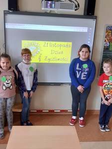 22 listopada br. w naszej szkole klasy edukacji wczesnoszkolnej obchodziły dzień dobrych uczynków i emocji znany pod nazwą Światowy Dzień Życzliwości i Pozdrowień. Głównym celem jego obchodów było uwrażliwienie uczniów, wzbudzenie w nich pozytywnych emocji oraz wyrażenie protestu przeciwko nietolerancji czy antypatii.