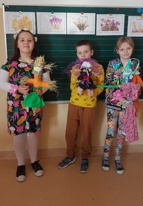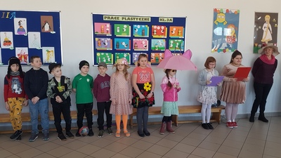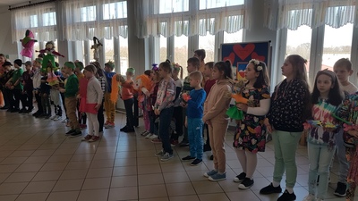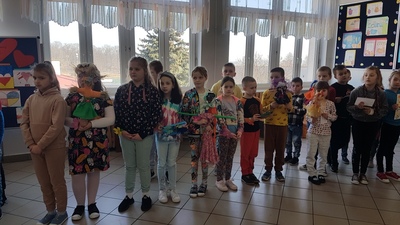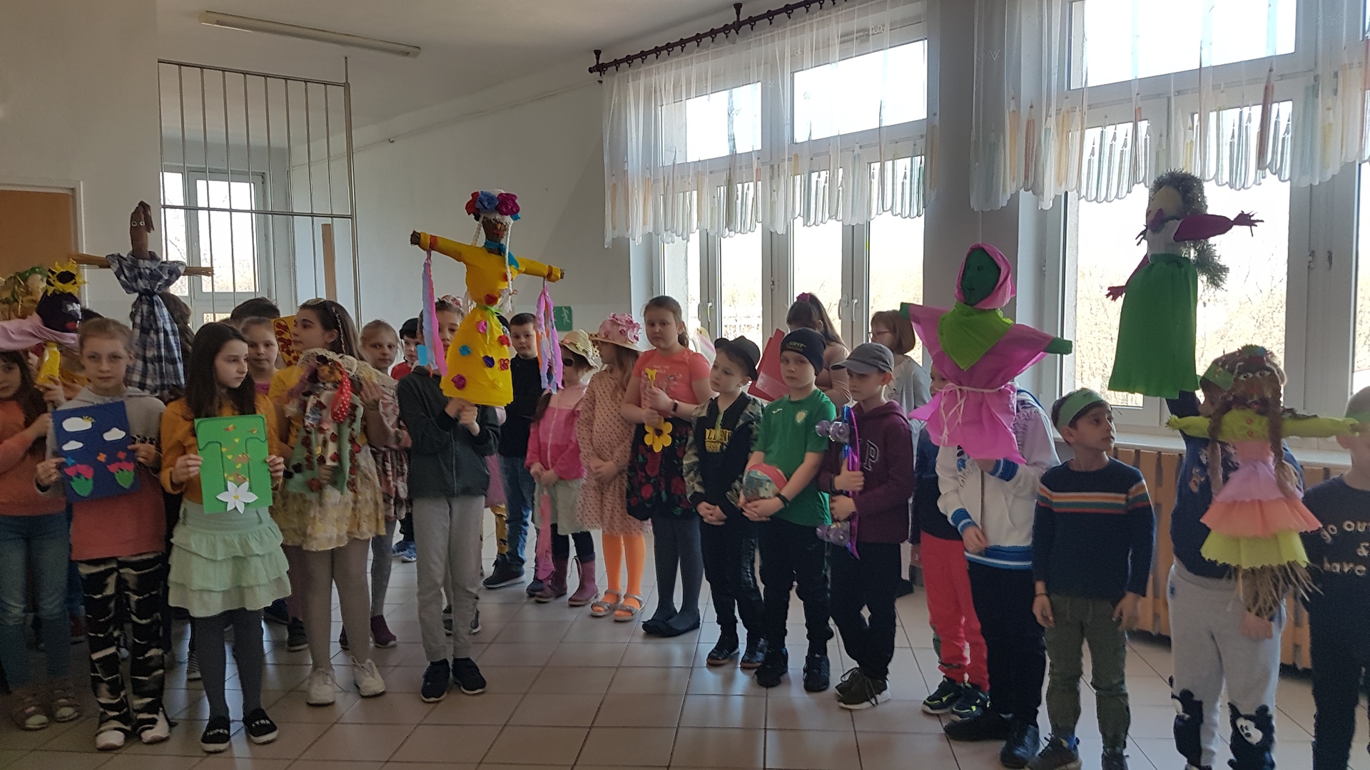 W poniedziałek - 21 marca 2022r. wszystkie dzieci z klas I - III wraz z wychowawczyniami radośnie i kolorowo przywitały długo oczekiwaną, nową porę roku. Pamiętano oczywiście o zwyczajach i symbolach związanych z nadejściem wiosny. Były więc wykonane z wielką pomysłowością słomiane kukły - marzanny, z którymi dzieci przemaszerowały w kolorowym korowodzie wokół szkoły i szkolnych stawów. Było ognisko, w którym na znak pożegnania zimy spłonęły wszystkie marzanny. Były wiersze, piosenki, przysłowia, pokaz wiosennej mody, zagadki, prace plastyczne przygotowane przez dzieci z poszczególnych klas. Były również wielobarwne, wesołe stroje, bo zgodnie z wcześniej zamieszczonym fragmentem wiersza - skoro mamy święto wiosny, każdy musi być radosny.