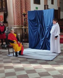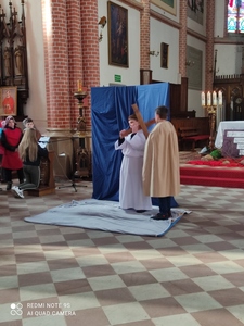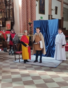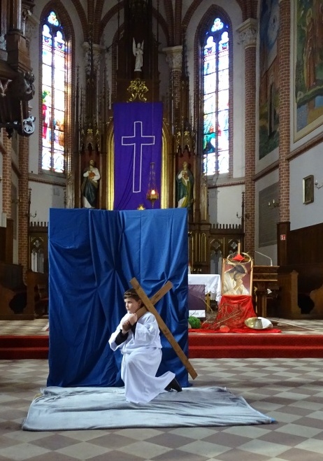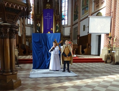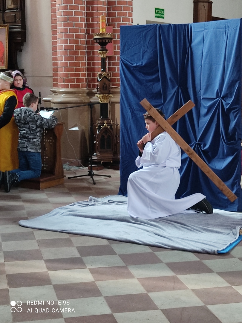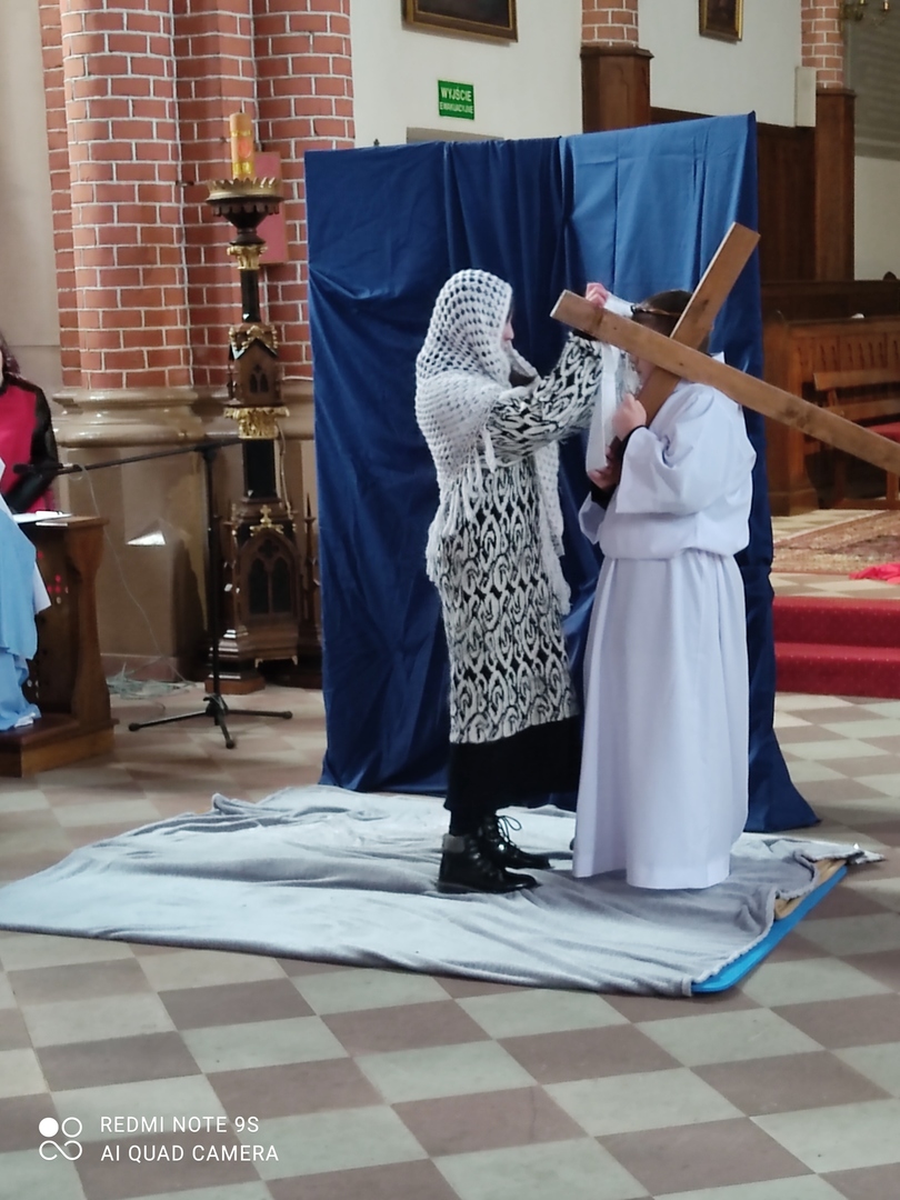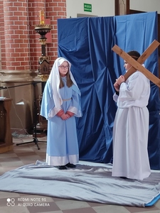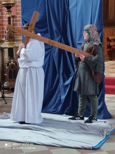 W piątek 8 kwietnia podczas Drogi Krzyżowej mogliśmy zobaczyć krótką inscenizację z ostatnich chwil życia Jezusa. W klimat wydarzeń sprzed 2000 lat wprowadzili nas uczniowie uczestniczący w zajęciach kółka religijnego. Podczas Drogi Krzyżowej spotkaliśmy w kościele m.in.: Poncjusza Piłata, Matkę Jezusa Maryję, Szymona Cyrenejczyka, Świętą Weronikę ocierającą umęczoną twarz Jezusa oraz niewiasty jerozolimskie towarzyszące Jezusowi w drodze na Golgotę.