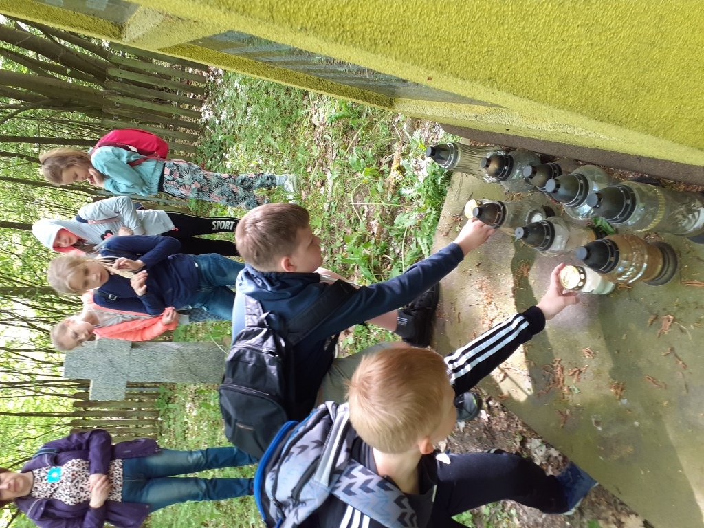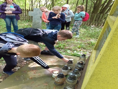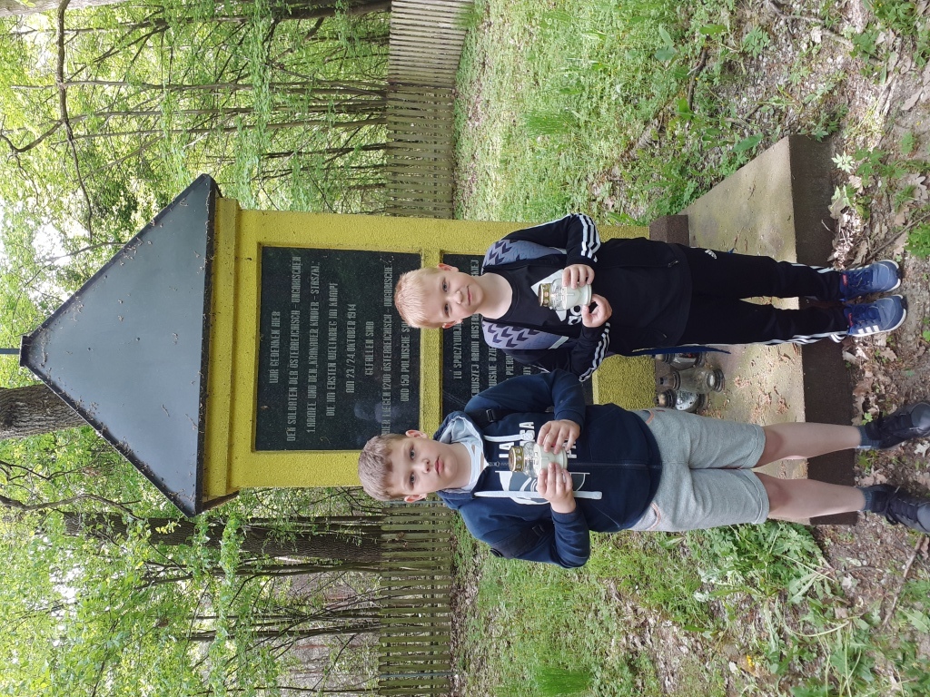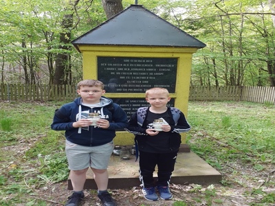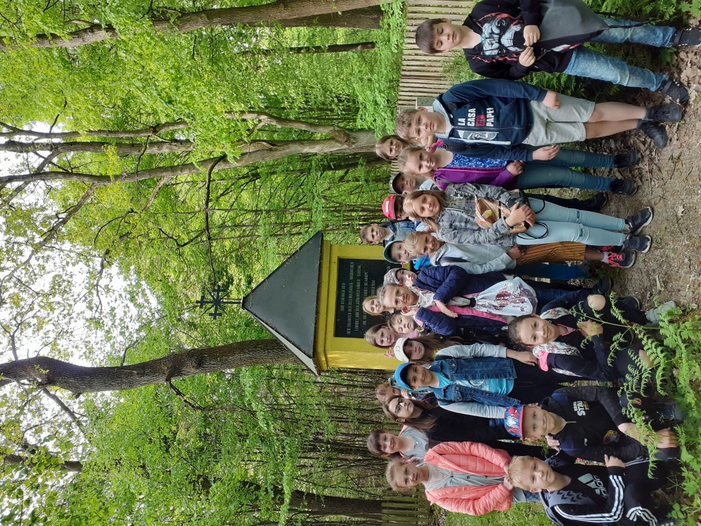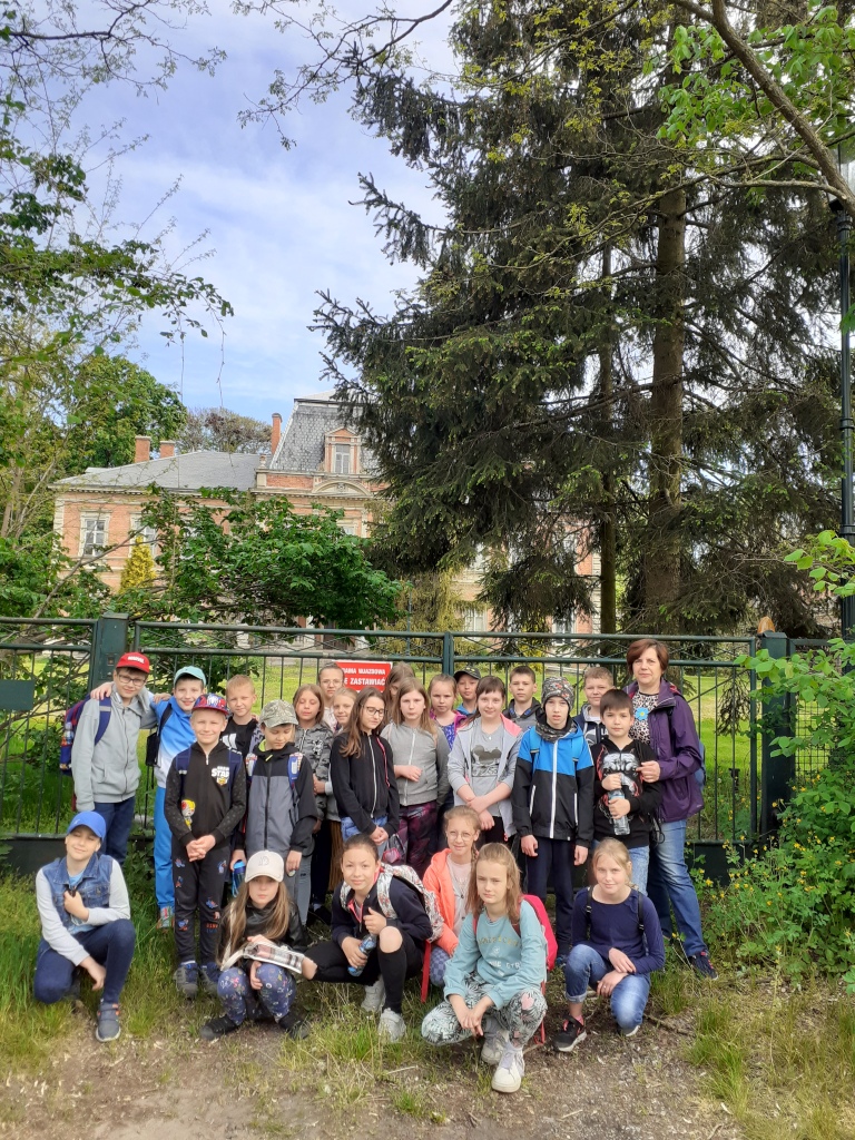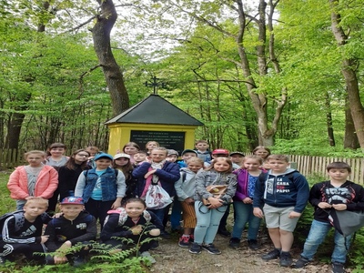 W dniu 13 maja 2022 r. uczniowie klas III a i III b wraz z opiekunami wybrali się na spacer po najbliższej okolicy. Celem spaceru było poznanie walorów historycznych i przyrodniczych naszej małej ojczyzny. Pierwszym etapem naszej wędrówki była oczyszczalnia ścieków. Uczniowie zwiedzili zakład - poznali poszczególne etapy oczyszczania wody poprzez filtrowanie, a następnie oczyszczanie jej za pomocą odpowiednich bakterii. W drodze do miejsca Pamięci Narodowej uczniowie zatrzymali się przed pałacem z końca XIX w. Kolejnym etapem był cmentarz wojenny z okresu I wojny światowej. Uczniowie odczytali informacje umieszczone na pomniku, następnie wszyscy w skupieniu oddali cześć poległym minutą ciszy. Następnie ścieżką leśną udali się do miejsca gdzie znajduje się pomnik przyrody – dąb. Zwrócili uwagę na jego rozłożystą koronę oraz na grubą, głęboko spękaną korę. Miłym zakończeniem spaceru był piknik. Spacer nie tylko wzbudził zainteresowanie uczestników historią i przyrodą regionu, ale był również świetną okazją do integracji grupy.