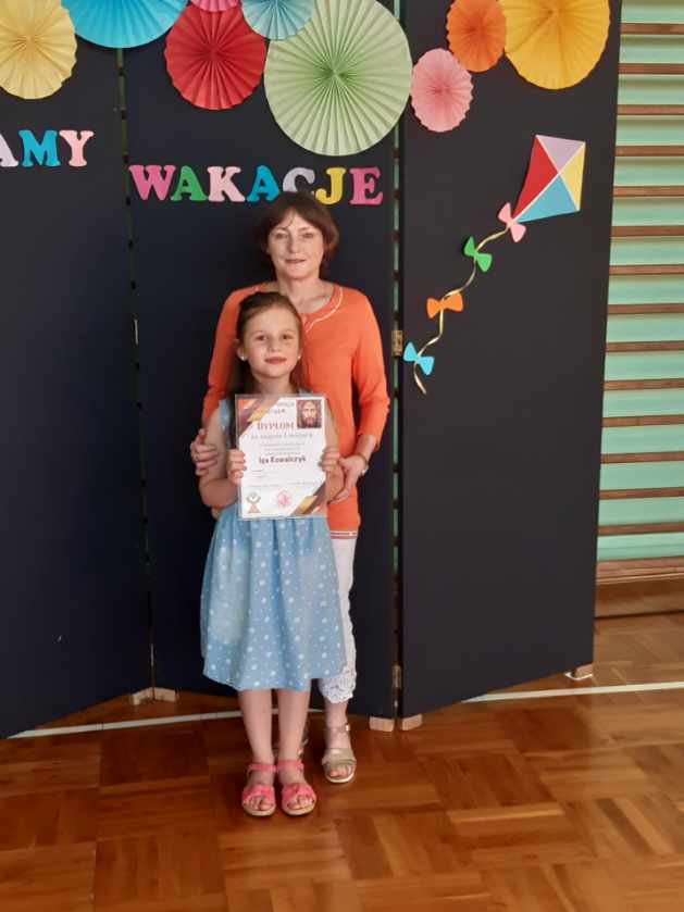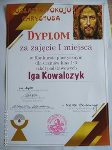 W bieżącym roku szkolnym I miejsce zajęła Iga Kowalczyk uczennica klasy II b w najważniejszym diecezjalnym konkursie plastycznym. Dnia 23.06.2022 r podczas ,,Gali Mistrzów”, Iga otrzymała nagrodę ufundowaną przez organizatorów z rąk Pani Dyrektor oraz nagrodę od Wójta naszej gminy.