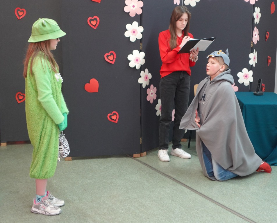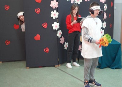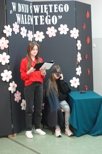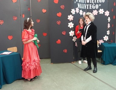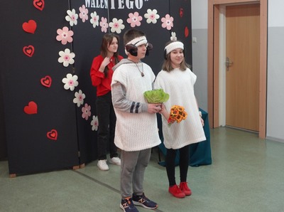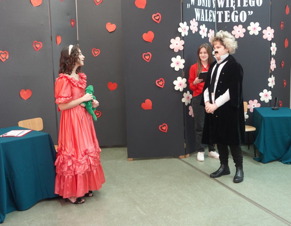 Tuż przed feriami Szkolne Koło Teatralne zaprosiło uczniów klas IV - VIII na zabawny program walentynkowy, w którym zaprezentowane zostały fragmenty różnych tekstów literackich, nawiązujących do uczucia miłości. Na szkolnej scenie nie mogło więc zabraknąć słynnych literackich par: Romea i Julii z tragedii Szekspira, Klary i Papkina z komedii Fredry, Żurawia i Czapli czy innych zakochanych zwierząt z wierszy Brzechwy. Uczniowie znakomicie poradzili sobie z kolejnym aktorskim zadaniem, wywołując uśmiech na twarzach widzów. Doskonałym uzupełnieniem przepełnionych humorem dialogów były barwne kostiumy i nastrojowa muzyka.