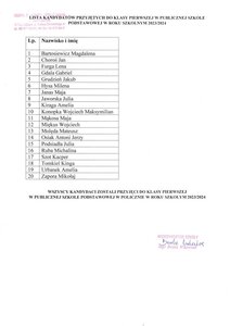 LISTA KANDYDATÓW PRZYJĘTYCH DO KLASY PIERWSZEJ - 2023/2024 Zdjęcia Zobacz również LISTA KANDYDATÓW PRZYJĘTYCH DO PRZEDSZKOLA SAMORZĄDOWEGO... LISTA KANDYDATÓW PRZYJĘTYCH DO ODDZIAŁÓW PRZEDSZOLNYCH... LISTA KANDYDATÓW PRZYJĘTYCH POWYŻEJ PIĘCIOGODZINNEJ... LISTA KANDYDATÓW PRZYJĘTYCH DO KLASY PIERWSZEJ... POWITANIE WIOSNY DZIEŃ MIKOŁAJA KOPERNIKA W NASZEJ SZKOLE! 28 marca 2023 Aktualności Wydrukuj Udostępnij Wyświetlono: 103
