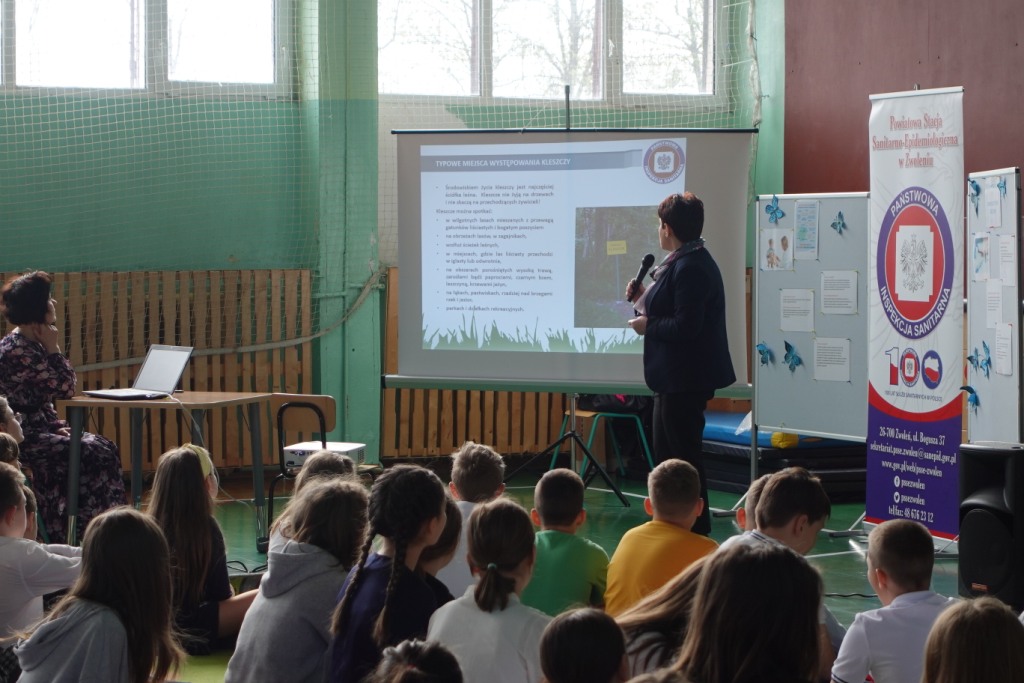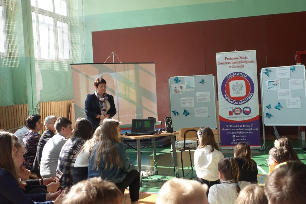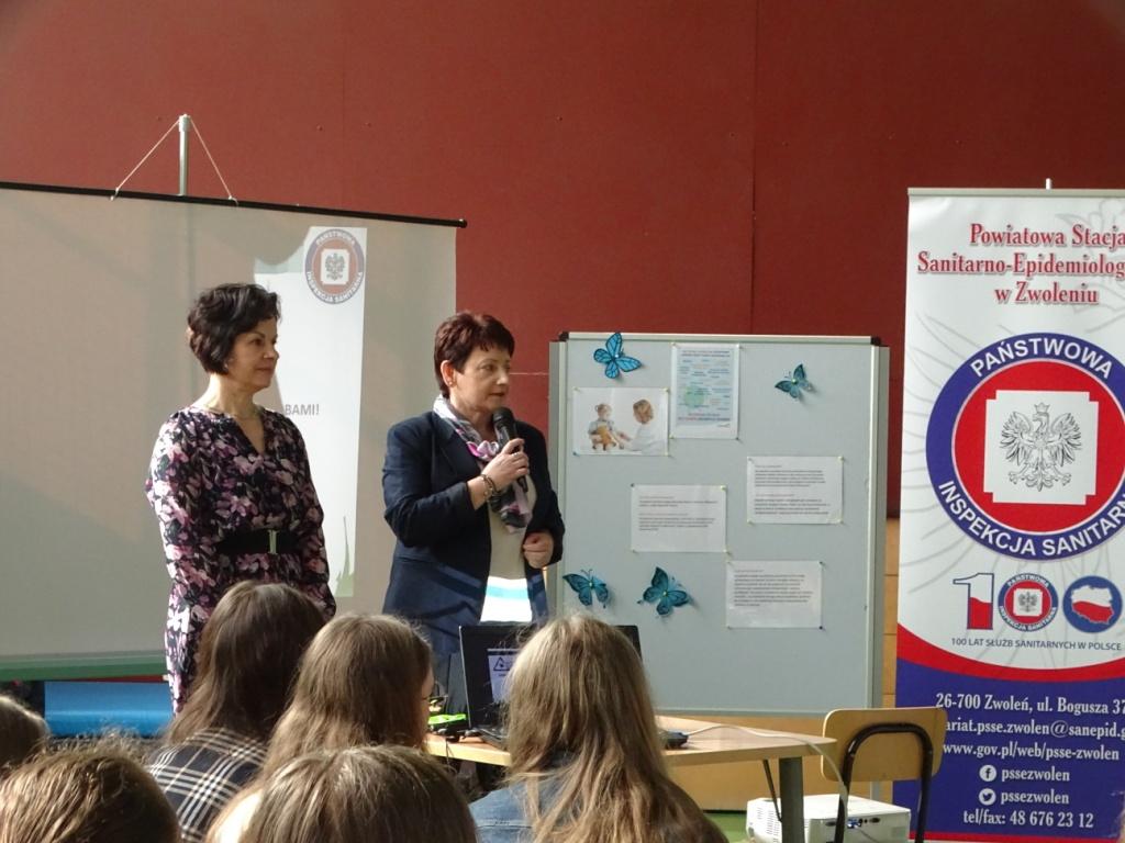 W ramach obchodów Europejskiego Tygodnia Szczepień w dniu 28 kwietnia uczniowie klas 4-8 naszej szkoły uczestniczyli w spotkaniach prowadzonych przez panie z Powiatowej Stacji Sanitarno-Epidemiologicznej w Zwoleniu. Tematyka pierwszego spotkania dotyczyła szeroko pojętej profilaktyki szczepień. Drugie spotkanie skierowane było do dziewcząt z klas 6-8 i dotyczyło profilaktyki raka piersi.