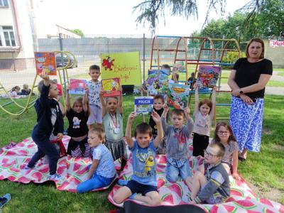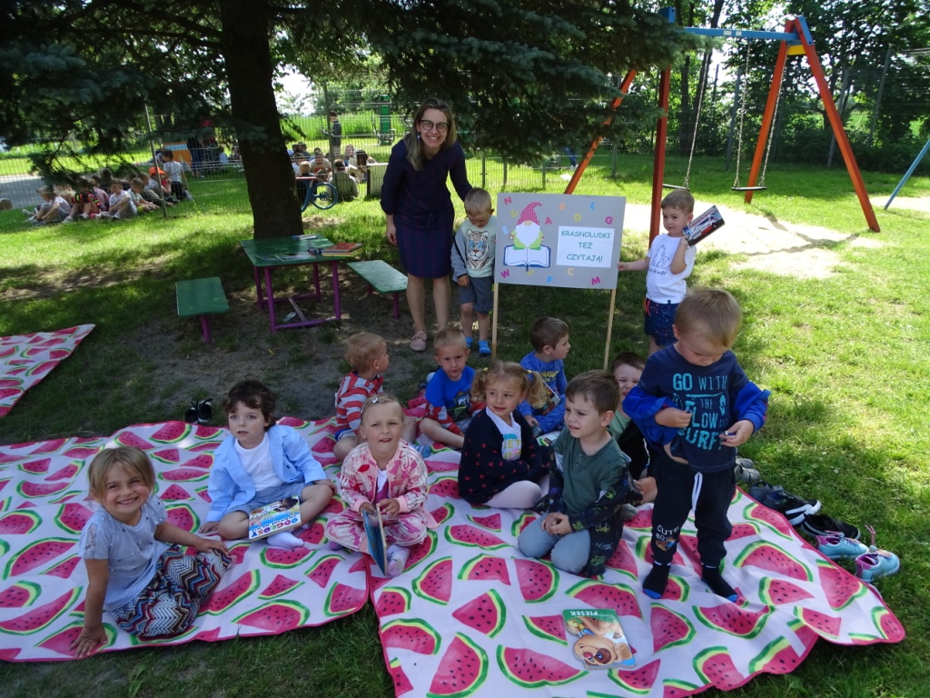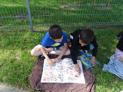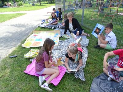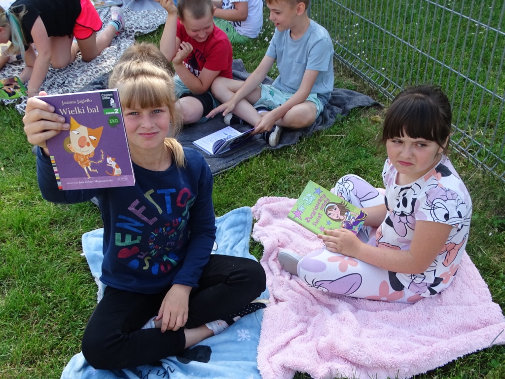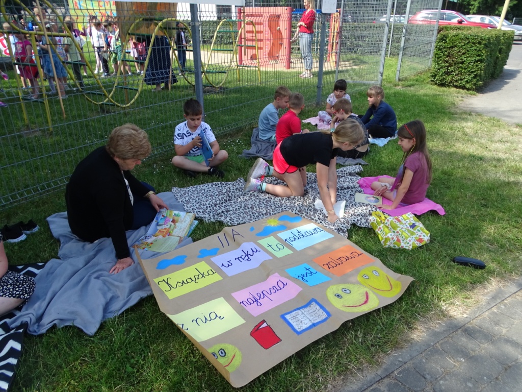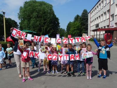 „7 czerwca 2023 roku o godz. 10.00 ponad 400 tys. młodych osób z całej Polski (i nie tylko) czytało książki. Chcieli obalić stereotyp i pokazać, że lubią czytać. Przy okazji próbowali pobić ustanowiony dwa lata temu rekord 459 409 osób czytających w tym samym momencie. Tak naprawdę rekord był pretekstem, a chodziło o to, by sobie poczytać. Bez przymusu, w miłych okolicznościach, we wspólnym gronie. Biblioteki, szkoły, przedszkola i inne instytucje z całej Polski stworzyły największą akcję czytelniczą na niespotykaną dotąd skalę.” My dołożyliśmy do tego swoją cegiełkę. Z wielką radością przyjęliśmy informację, że po pandemicznej przerwie powraca akcja czytelnicza „Jak nie czytam, jak czytam”. Po raz kolejny nasza szkoła przyłączyła się do tej ogólnopolskiej akcji organizowanej przez redakcję czasopisma „Biblioteka w szkole”. Celem akcji jest między innymi: zwiększenie aktywności czytelniczej dzieci i młodzieży, inicjowanie mody na czytanie, wspieranie dzieci aktywnych czytelniczo, podkreślenie roli bibliotek w edukacji czytelniczej oraz pobicie rekordu Polski w jednoczesnym czytaniu. Organizatorem akcji na terenie szkoły była pani Anna Nowak – nauczyciel bibliotekarz, która wcześniej zgłosiła naszą szkołę do udziału w akcji i tak znalazła się ona na interaktywnej mapie uczestników. Dzień 7 czerwca był w naszej szkole dniem wycieczkowym, dlatego większość uczniów z klas 4-8 spędzała ten dzień poza szkołą. Jednak znaleźli się wśród nich miłośnicy czytania, którzy nie zapomnieli o zaproszeniu do udziału w akcji i zabrali ze sobą ulubione książki, aby o godz. 10.00 przyłączyć się do czytających w całej Polsce. Natomiast uczniowie klas 1-3, pozostali w szkole uczniowie klas 4-8 oraz dzieci z przedszkola i oddziału przedszkolnego pod opieką swoich nauczycieli punktualnie o godz. 10.00 zgromadzili się na placu przed szkołą (łącznie tego dnia czytało w naszej szkole około 150 osób). Każdy z nas trzymał w ręku swoją ulubioną książkę. Pogoda była przepiękna. Najmłodsi wybrali na miejsce relaksu z książką plac zabaw, ci nieco starsi rozłożyli swoje koce w cieniu drzew. Niezależnie od miejsca wszyscy z wielkim zainteresowaniem pochłaniali fragmenty swoich ulubionych książek wypożyczonych z biblioteki szkolnej lub przyniesionych z domu. Przygotowując się do udziału w akcji każda klasa przy wsparciu wychowawcy przygotowała coś co wyróżniało ją spośród innych. Były więc plakaty, transparenty, hasła, specjalnie na tę okazję przygotowane układy taneczne. Wszystkim bardzo podobała się taka forma czytania, która, mamy nadzieję, zachęci uczniów do sięgania po książkę częściej.