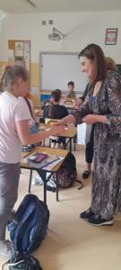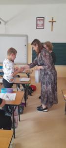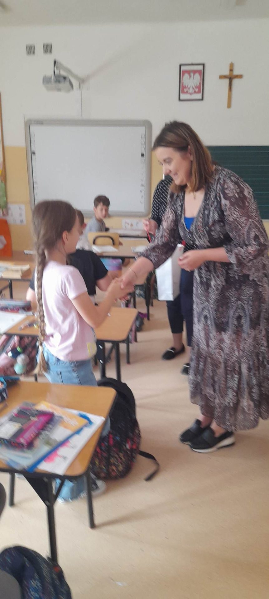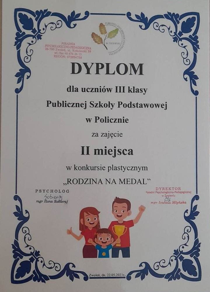 W dniu 13.06.2023 r. klasę III b odwiedziły przedstawicielki Poradni Psychologiczno - Pedagogicznej w Zwoleniu, Pani Ilona Sobieraj oraz Pani Joanna Zubrzycka, które wręczyły uczniom upominki w związku z zajęciem przez nich II miejsca w konkursie plastycznym "RODZINA NA MEDAL" pod patronatem honorowym Pana Stefana Bernaciaka Starosty Powiatu Zwoleńskiego.
