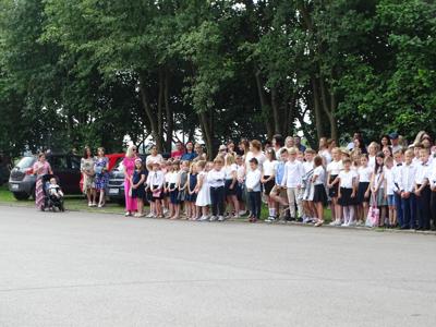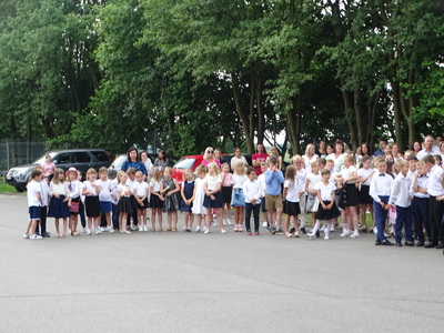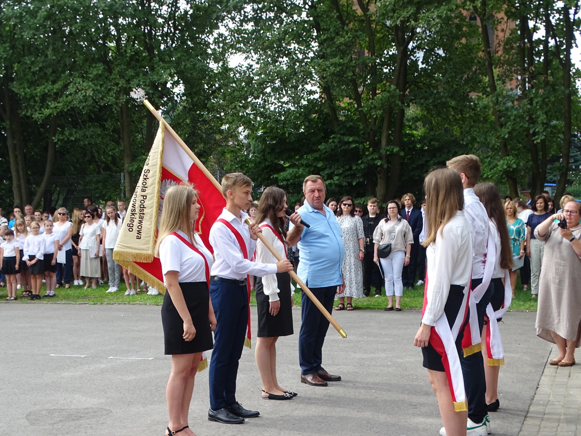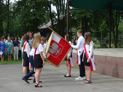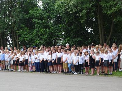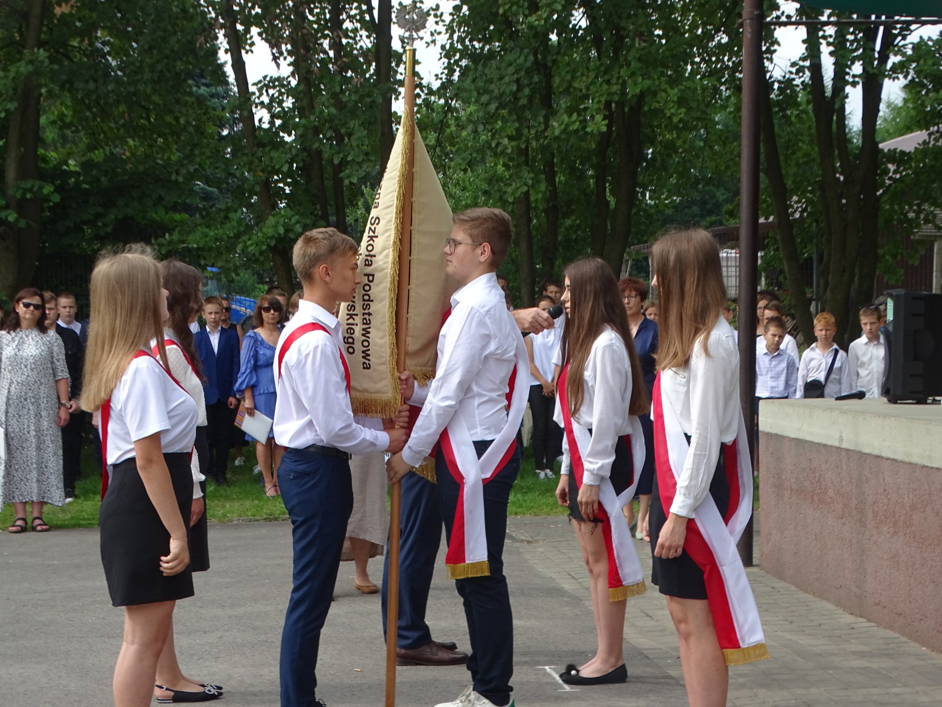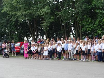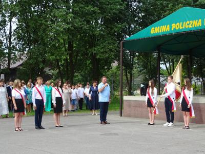 W piątek, 23 czerwca o godz. 9.00 na placu szkolnym odbyła się uroczystość zakończenia roku szkolnego 2022/2023 w Publicznej Szkole Podstawowej w Policznie. Uroczystość rozpoczęła się od ceremonii przekazania sztandaru klasom siódmym oraz odśpiewania Hymnu Państwowego. Następnie Pani Dyrektor Jolanta Kalinowska serdecznie powitała wszystkich przybyłych oraz krótko podsumowała mijający rok szkolny. Jeszcze raz bardzo serdecznie pogratulowała wszystkim wyróżnionym oraz zwycięzcom w konkursach i zawodach. Szczególne gratulacje odebrała uczennica kl.6b Barbara Kozieł, która uzyskała najwyższą średnią ocen w tym roku szkolnym. Następnie głos zabrała Przewodnicząca Rady Rodziców Pani Dominika Gazda, a chwilę później na scenie swoje świadectwa z paskiem odbierali uczniowie z klas IV-VIII. Pozostali uczniowie otrzymali świadectwa od swoich wychowawców w salach lekcyjnych. W imieniu absolwentów głos zabrał Miłosz Gutowski, który podziękował wszystkim pedagogom i pracownikom szkoły, kilka słów skierował także do młodszych kolegów. Życzenia powodzenia i realizacji marzeń złożyła ósmoklasistom uczennica klasy siódmej - Weronika Nicińska.