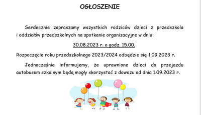 OGŁOSZENIE Zdjęcia Zobacz również Wyniki egzaminu ósmoklasisty Rada Rodziców Rozpoczęcie roku szkolnego w szkole podstawowej OGŁOSZENIE INFORMACJA - RODZICE DZIECI Z KLASY I Dowozy w roku szkolnym 2023/2024 28 sierpnia 2023 Aktualności Wydrukuj Udostępnij Wyświetlono: 154