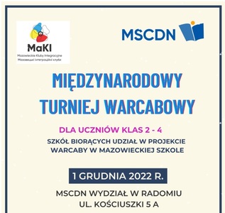 13 grudnia 2023r. siedmiu uczniów klas II-IV reprezentowało naszą szkołę na II Międzynarodowym Turnieju Warcabowym. Turniej po raz kolejny był zorganizowany przez Mazowieckie Samorządowe Centrum Doskonalenia Nauczycieli w Radomiu. Nad prawidłowym przebiegiem gry czuwał pan Damian Reszka prezes zarządu Polskiego Związku Warcabowego. Uczniowie rozegrali po pięć rund z przeciwnikiem wylosowanym przez komputer. Podczas gry byli bardzo zaangażowani i skupieni. Po rozegraniu ostatniego meczu nastąpiło ogłoszenie wyników, które dla naszych uczniów prezentują się następująco: