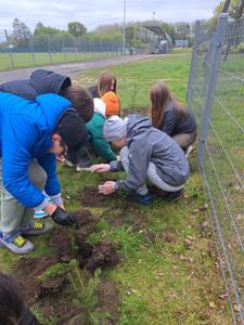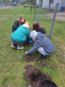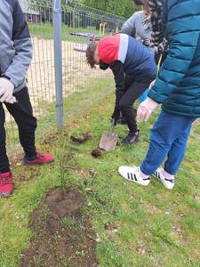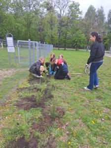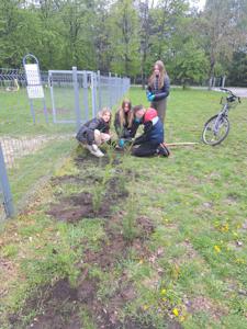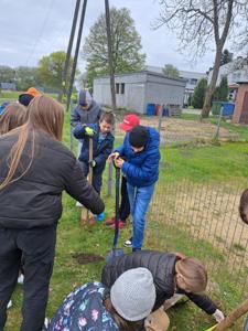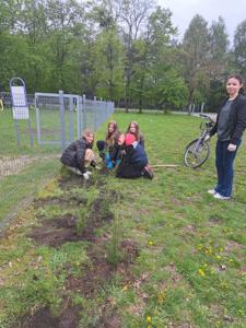 W ramach obchodów Dnia Ziemi uczniowie klasy V a posadzili sadzonki świerków podarowane przez NADLEŚNICTWO ZWOLEŃ w MIODNYM.