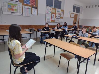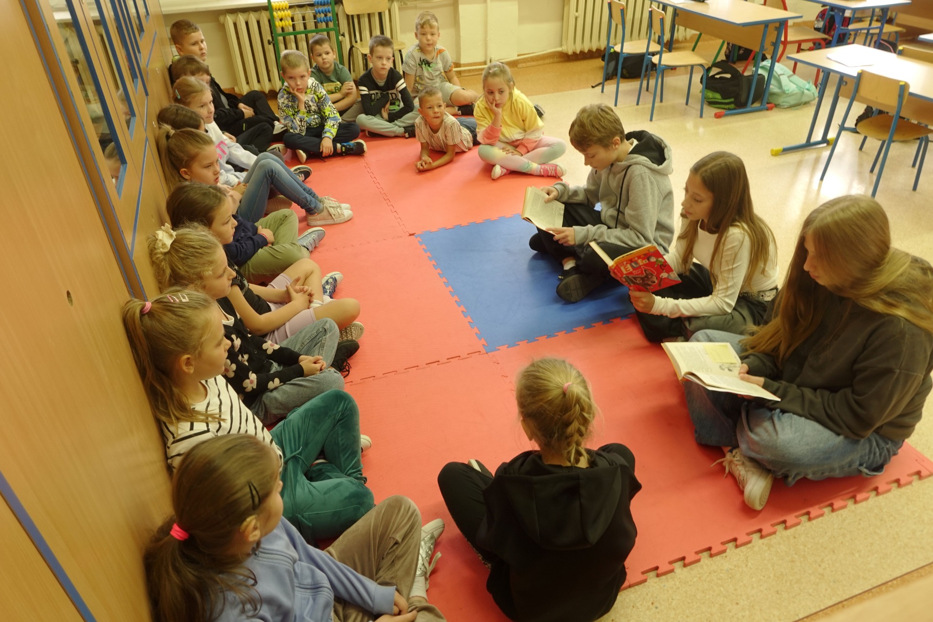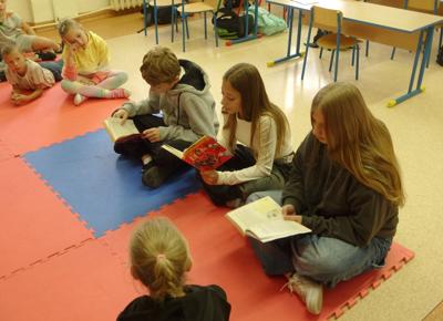 W klasach I-III swoim młodszym kolegom czytali chętni uczniowie z klas siódmych i ósmych. W czytelni biblioteki szkolnej uczniom czytała pani Ania- nasza szkolna bibliotekarka. Dzieciaki z ogromnym zainteresowaniem słuchały tych opowieści i pytały kiedy mogą przyjść, aby usłyszeć ciąg dalszy. Korzystaliśmy także z zasobów NINATEKI. Uczniowie mogli wysłuchać opowiadań czytanych przez znanych aktorów. Także w trakcie zajęć świetlicowych uczniowie czytali głośno kolegom swoje ulubione książki.
